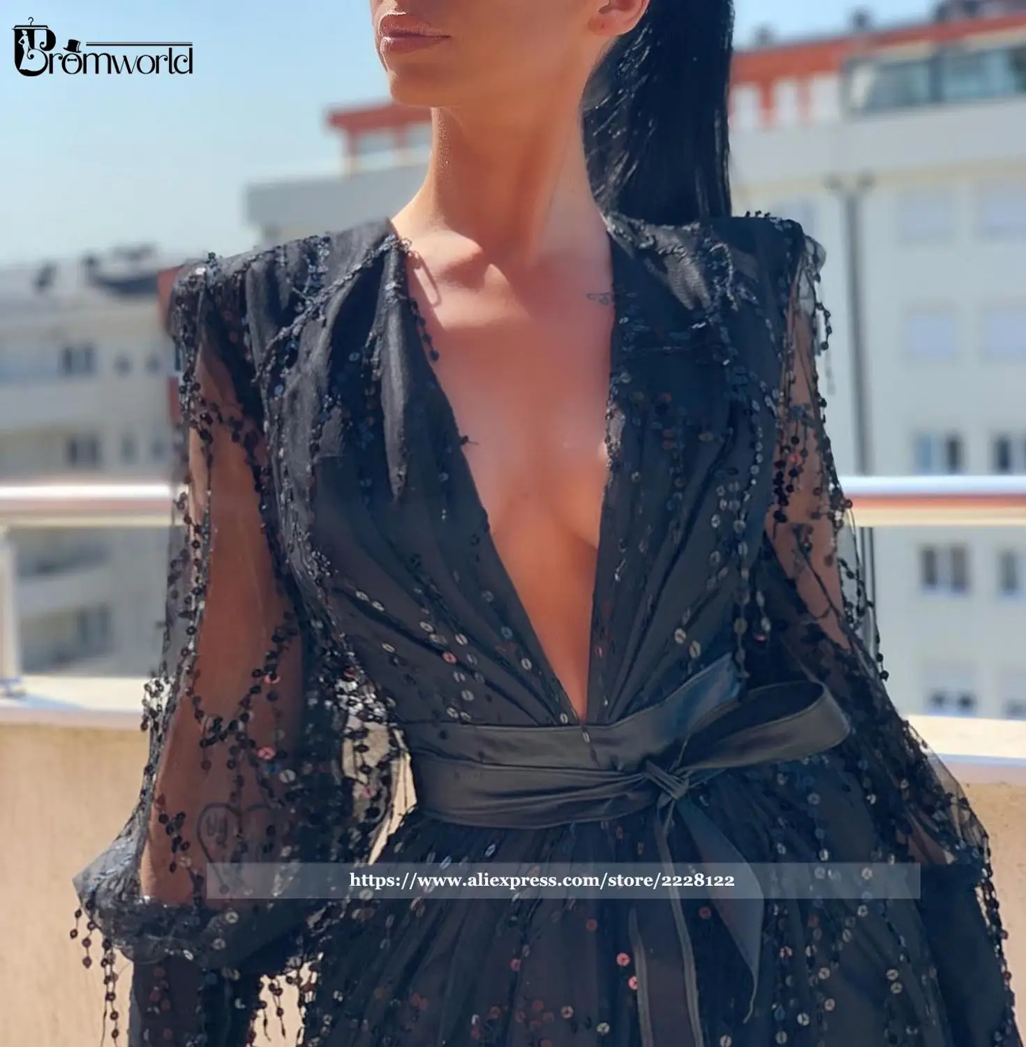 Сексуальное черное платье с разрезом для выпускного вечера с длинным рукавом и глубоким V-образным вырезом с блестками вечернее платье Макси Вечерние платья Дубай
