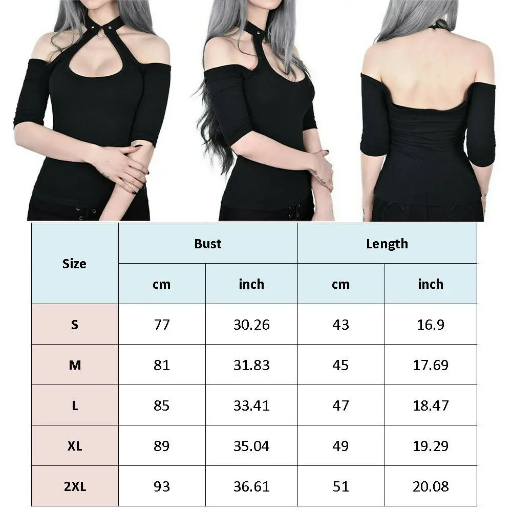 Черная Сексуальная рубашка с чокером, Женский Топ с коротким рукавом и открытыми плечами, готический однотонный топ с лямкой на шее и пряжкой, Блузка Панк-жилет, рубашки