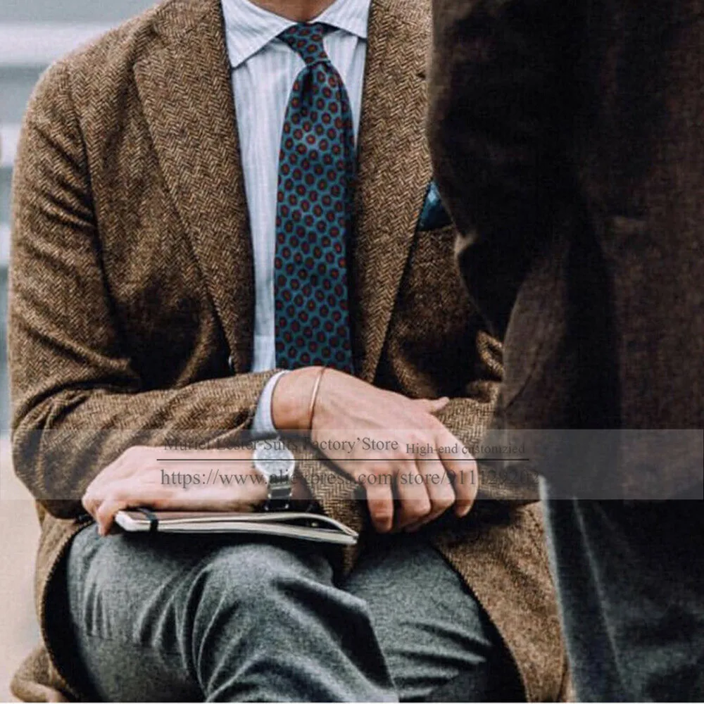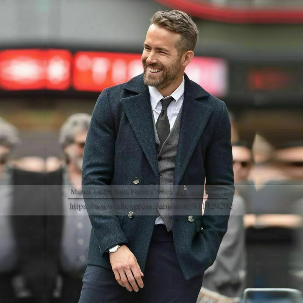 Мужской твидовый пиджак с широким лацканом, темно-синий однобортный классический блейзер из смесовой шерсти, деловой пиджак, вечерние наряды для свадьбы и ужина