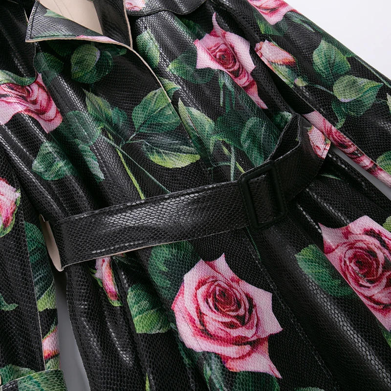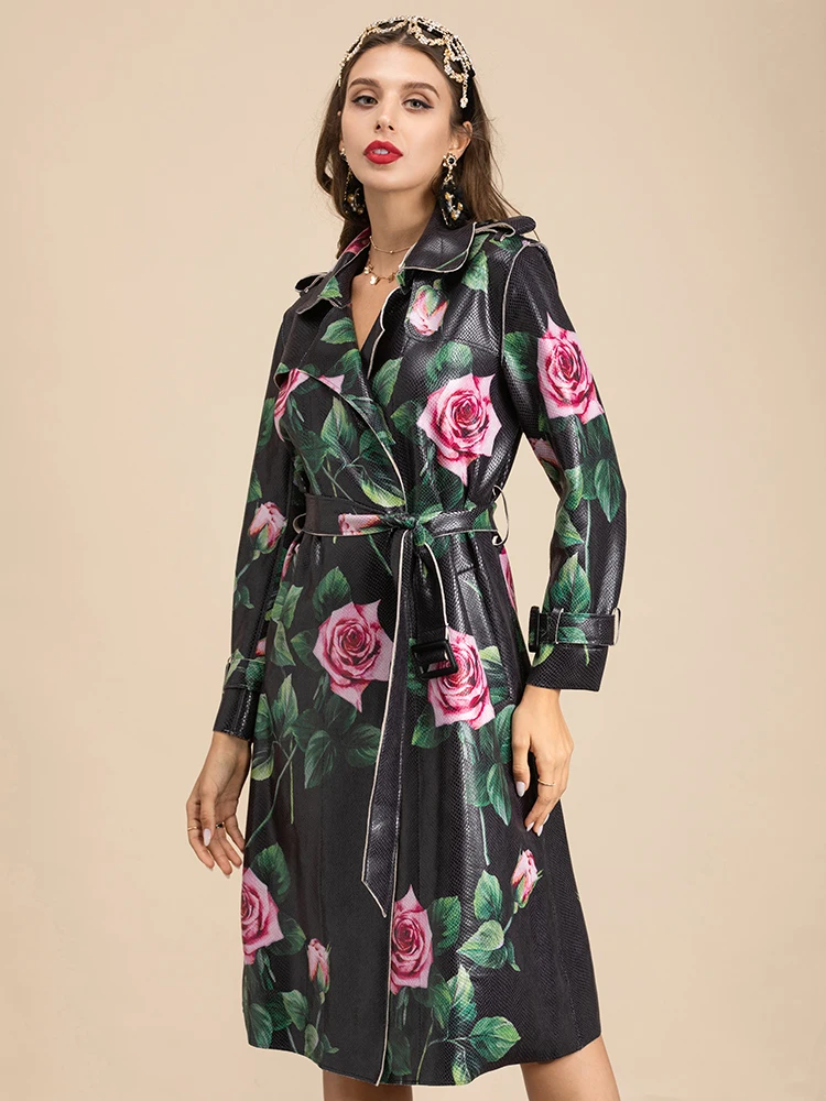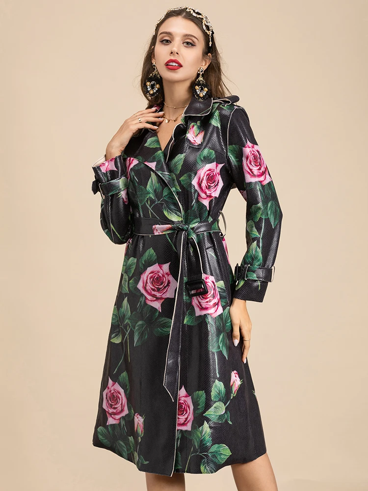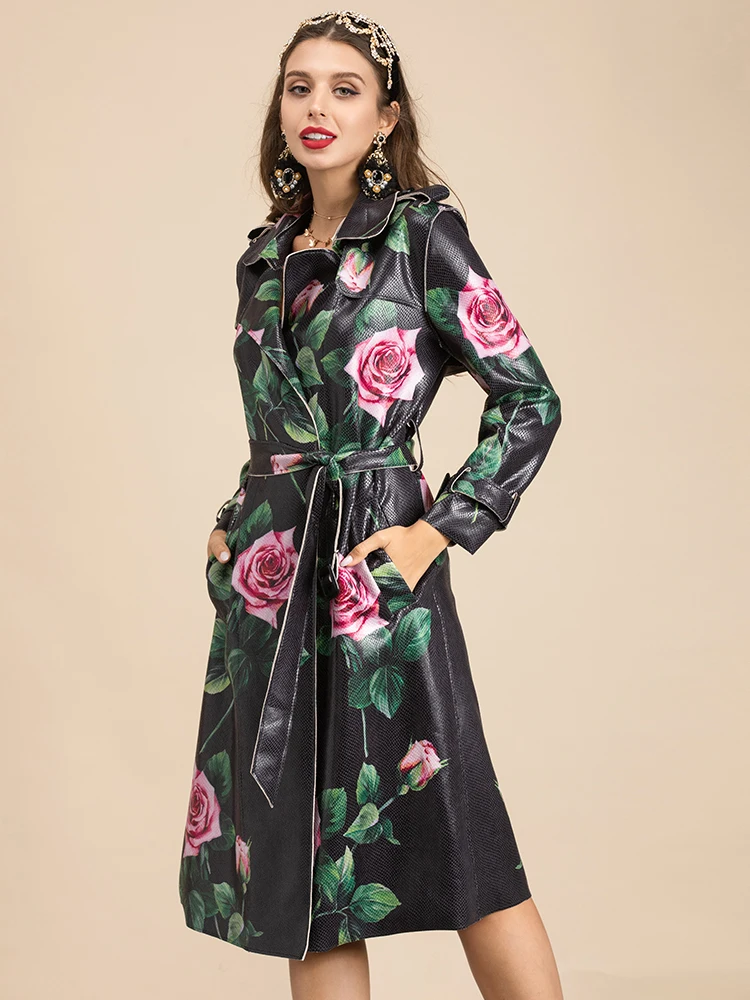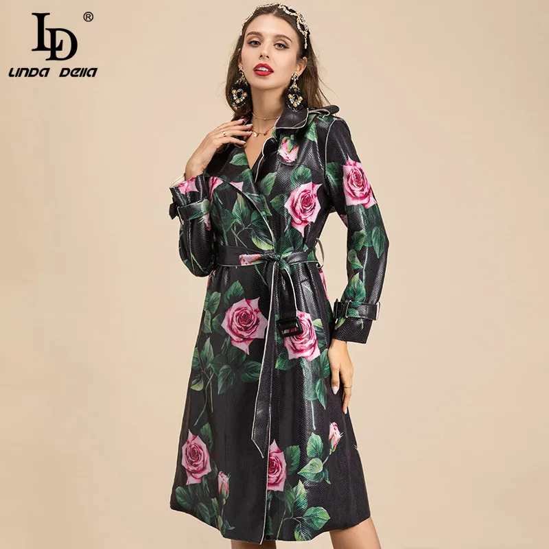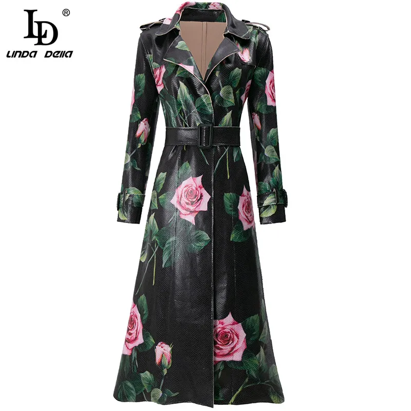 LD LINDA DELLA модный подиумный весенний длинный плащ из искусственной кожи, Женское пальто с отложным воротником и поясом, винтажное пальто с принтом розы, верхняя одежда