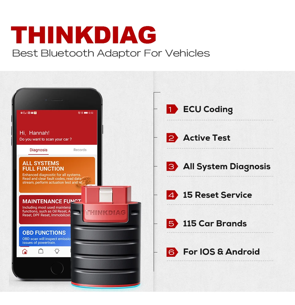 Первый интеллектуальный ключ OBDII с полным диагностическим уровнем OE! 1. Считывание кодов неисправностей для всех систем, таких как ECM, TCM, ABS, SRS, BCM, IMM, BMS, TPMS, SAS, топливная система, светильник, система стеклоочистителя и т. д. 2. Двунаправленный/Активный тест + кодирование ECU + адаптация + соответствие 3. Полный OBD II и EOBD функции для полного сканирования системы 4. 15 функций обслуживания + инструмент для автоматического сканирования 5. Поддержка 115 марок автомобилей 6. Прямая передача данных + запись данных + Печать отчета о состоянии здоровья автомобиля + удаленный диагностический Автомобильный сканер 7. Сообщество владельцев транспортных средств 8. Совместимость с телефонами Android / iOS и планшетами 9. Размер ладони, портативный и мощный