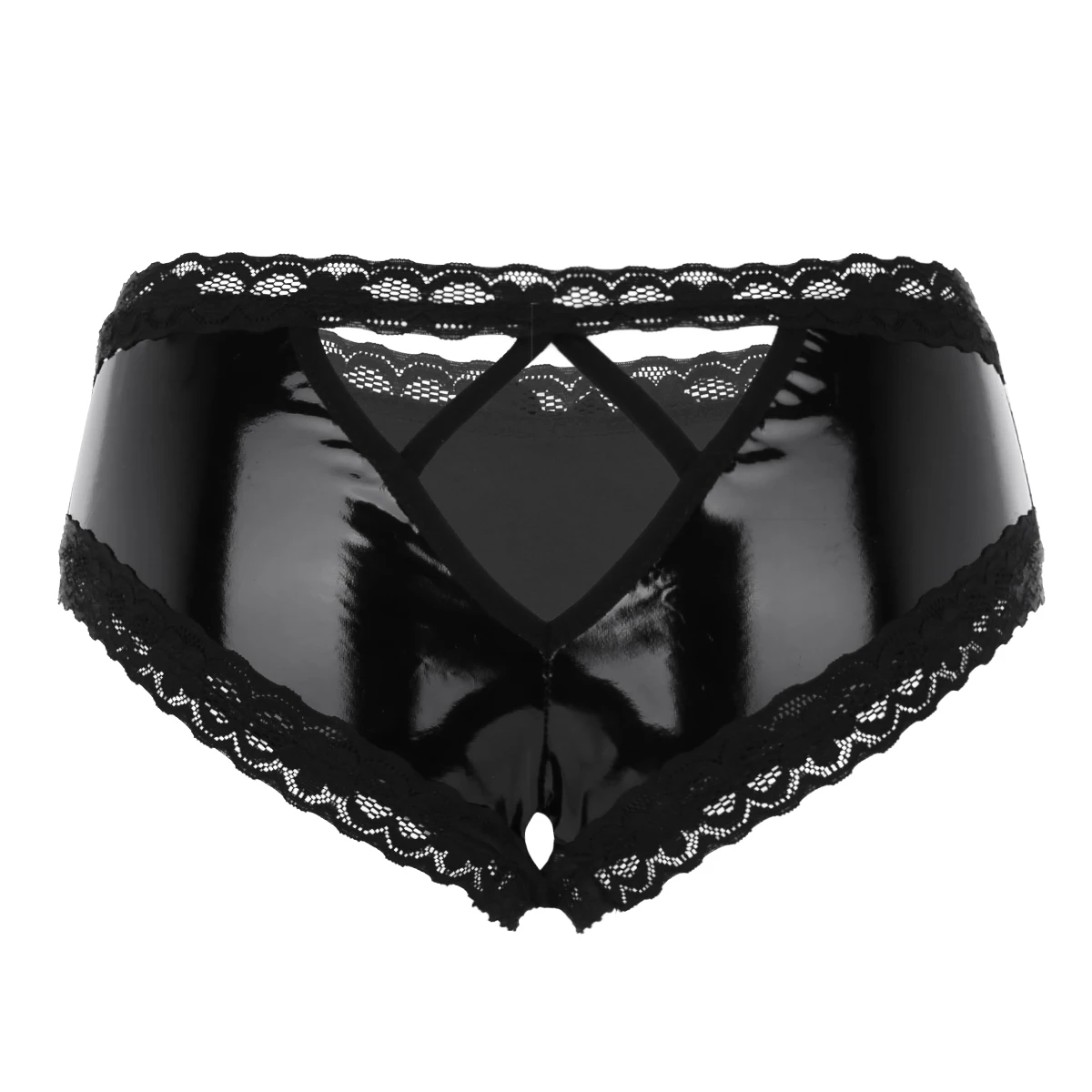 # S-XXL Черное женское нижнее белье из лакированной кожи с открытой промежностью и v-образным вырезом сзади