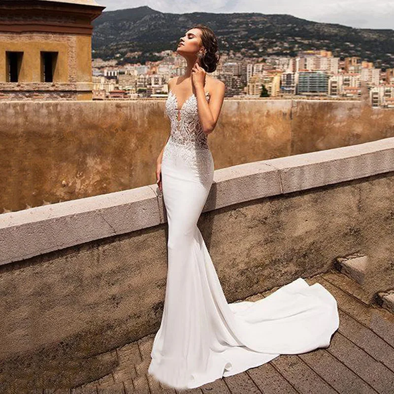 Сексуальное свадебное платье русалки для женщин с V-образным вырезом и кружевной аппликацией и открытой спиной, Пляжное свадебное платье для невесты