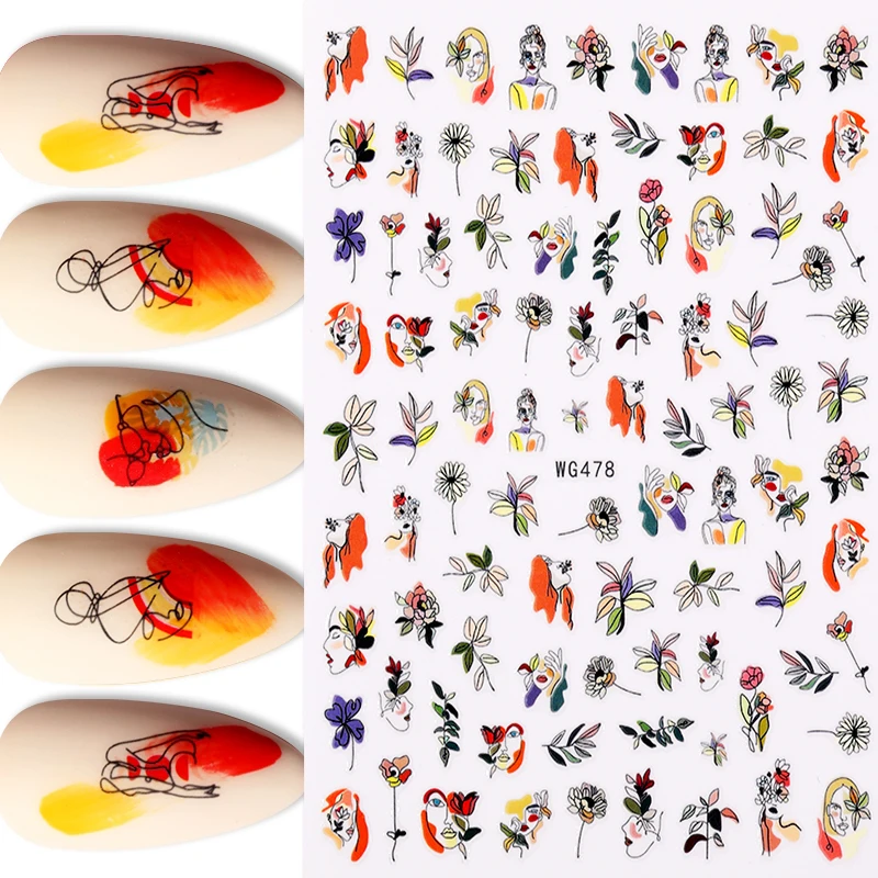 3D наклейки для ногтей, листья, цветной блок, узор, специальная переводная картинка, абстрактное женское лицо, наклейки, украшения для ногтей, 1 шт.