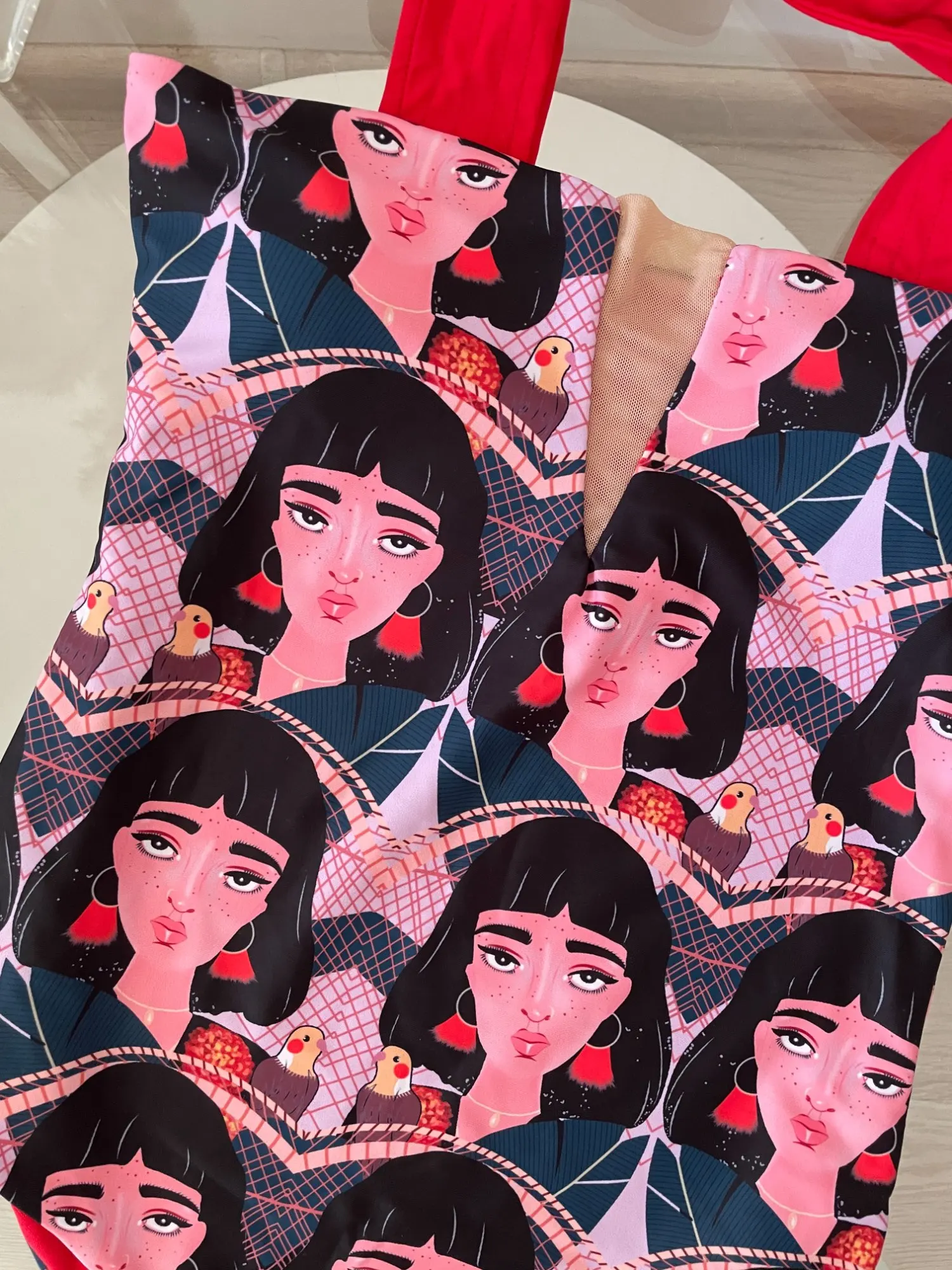 На размер 48-50 заказала XL, качество очень хорошее, строчки ровные, дублирующая ткань белого цвета, фасон необычный, есть маленькие прокладочки на груди, можно их достать, есть отверстие, даже девочки на принте почти симметрично расположены
