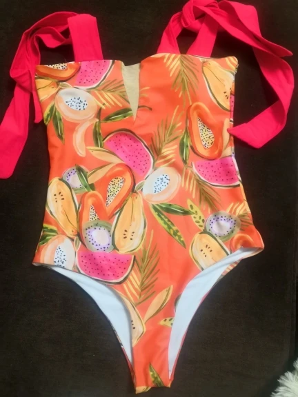 хороший купальник, размеры соответствуют. взяла оранжевый с фруктами, чуть бледнее, чем на картинке