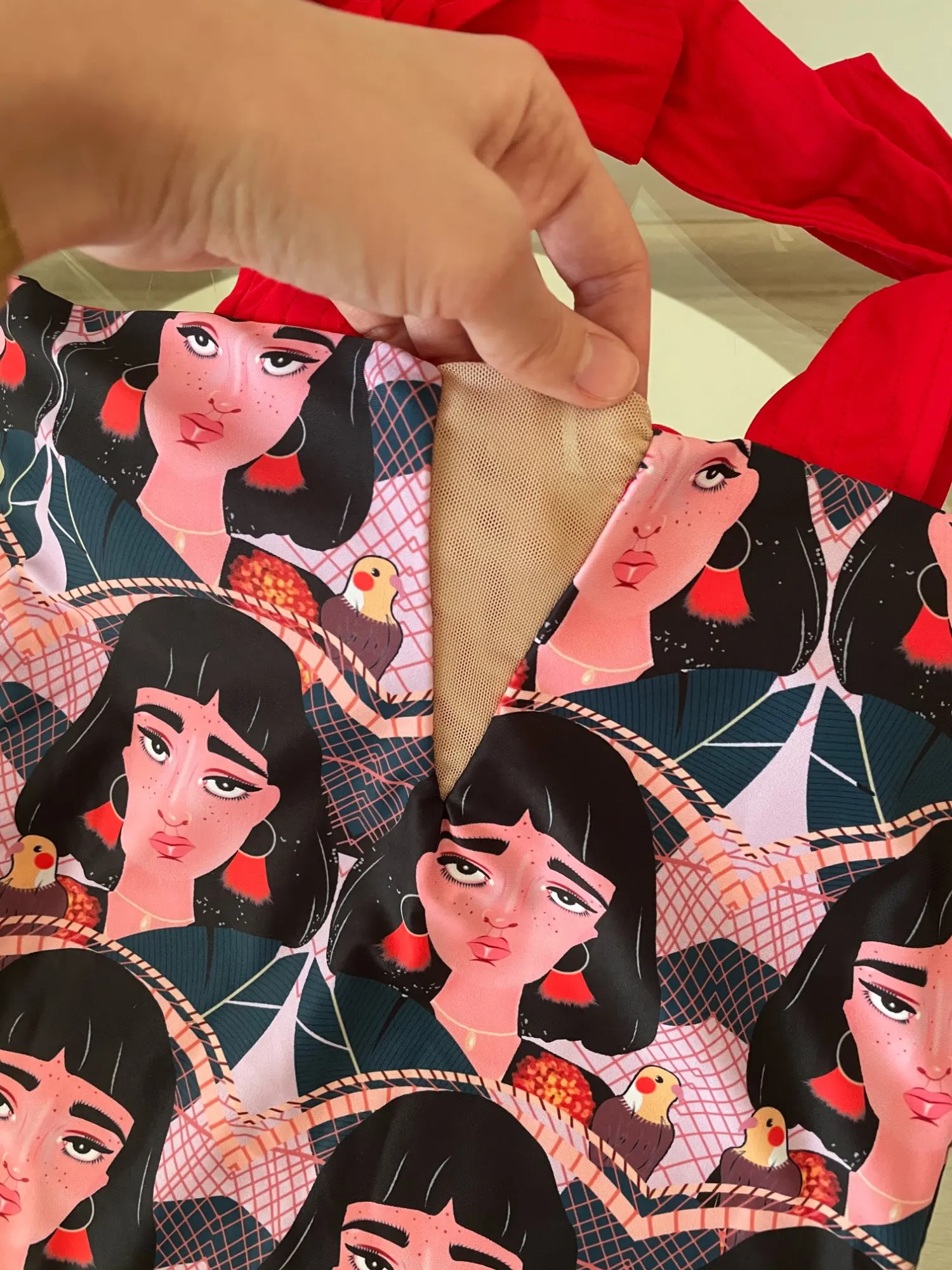 estampado y medidas exactas a las proporcionadas por el vendedor. Yo tengo una 95C de pecho y por eso pedí una L. No me gusta la ropa muy apretada. Tiene forro por todo el cuerpo y protectores en los pechos. Textura suave y agradable. Cintas para anudar anchas y elásticas. Me ha encantado.