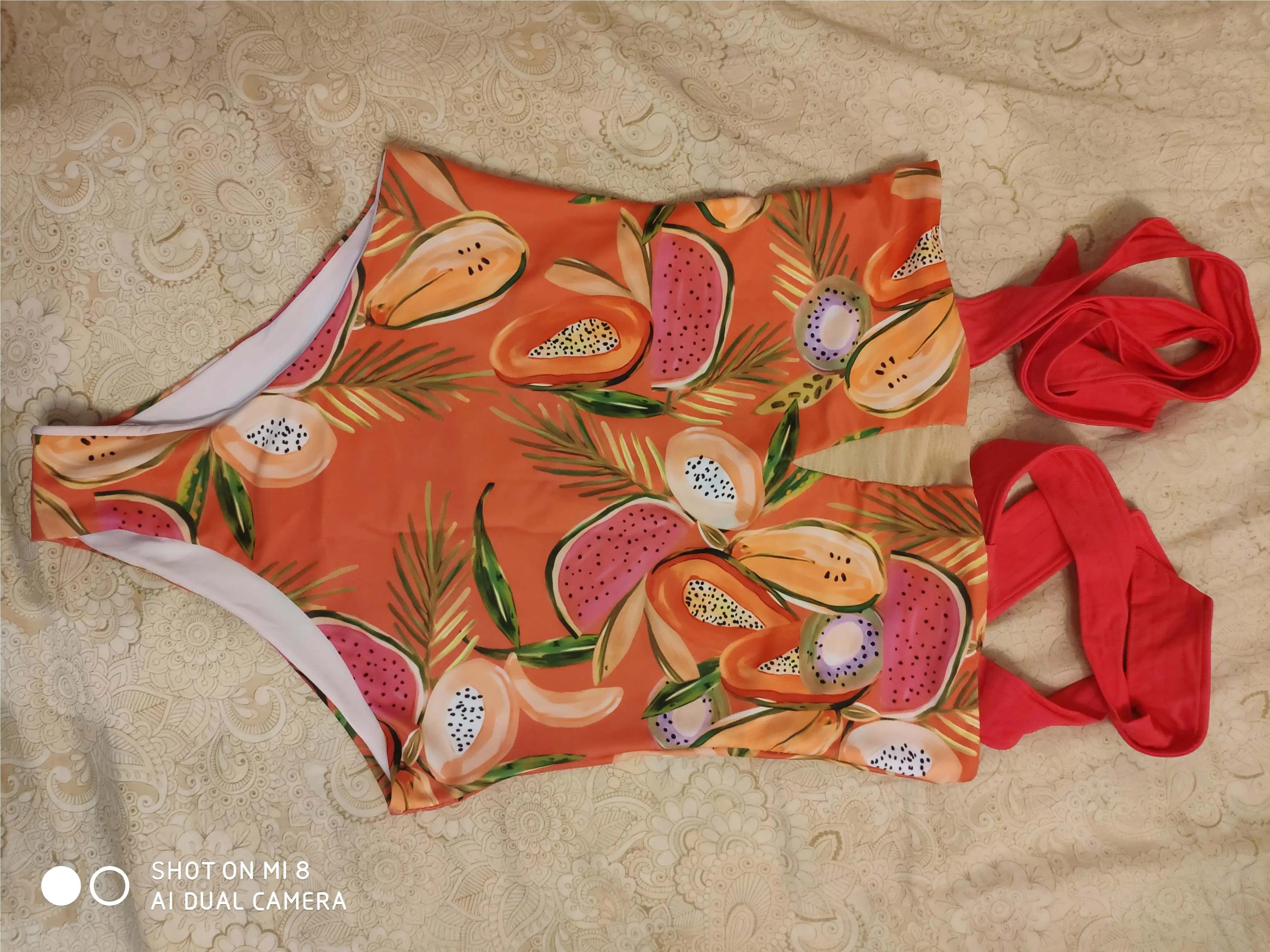 Доставка около трёх недель. На мне маркировка S - на параметры 85-70-90, рост 163 см подошло. Купальник слитный. Модель довольно закрытая. Спереди бежевая вставка-сетка в форме треугольника. Бретели широкие, завязать нужно самостоятельно. Легко отрегулировать под свой рост. Были вставки-чашечка. Подкладка такая же сочная. Низ довольно классический. Качество прекрасное. Придраться не к чему, никаких дефектов. Нитки не торчали. Купальник красивый и интересный. Довольно удобная закрытая модель. Мне он понравился.