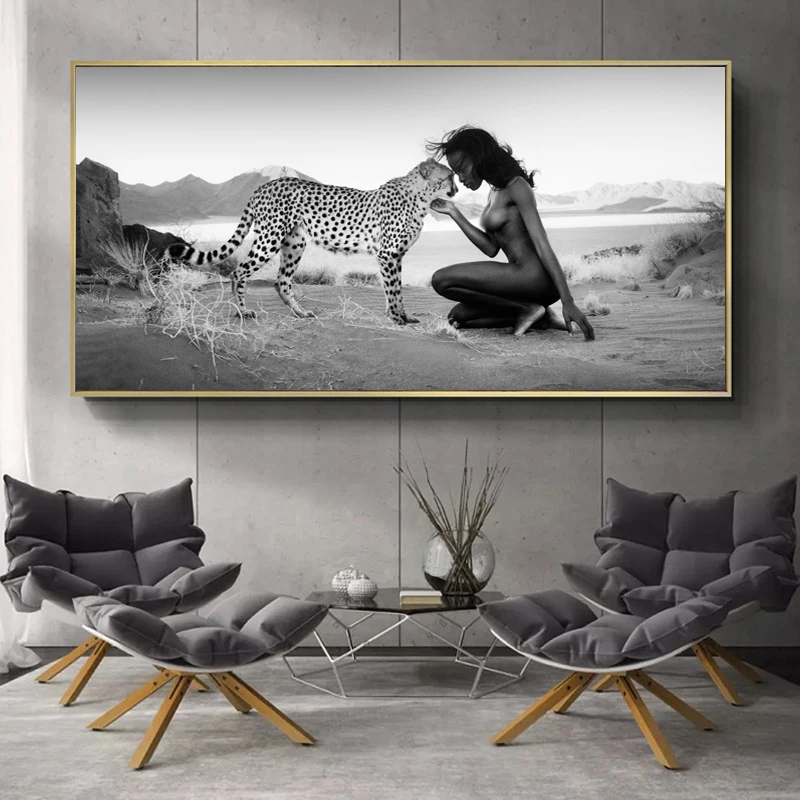 Черно-белая Картина на холсте Обнаженная женщина и животные, настен...
