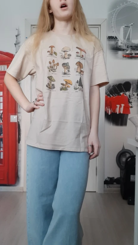 футболка супер пупер,заценила грибочки, но если хотите оверсайз берите ххл, на рост 165.