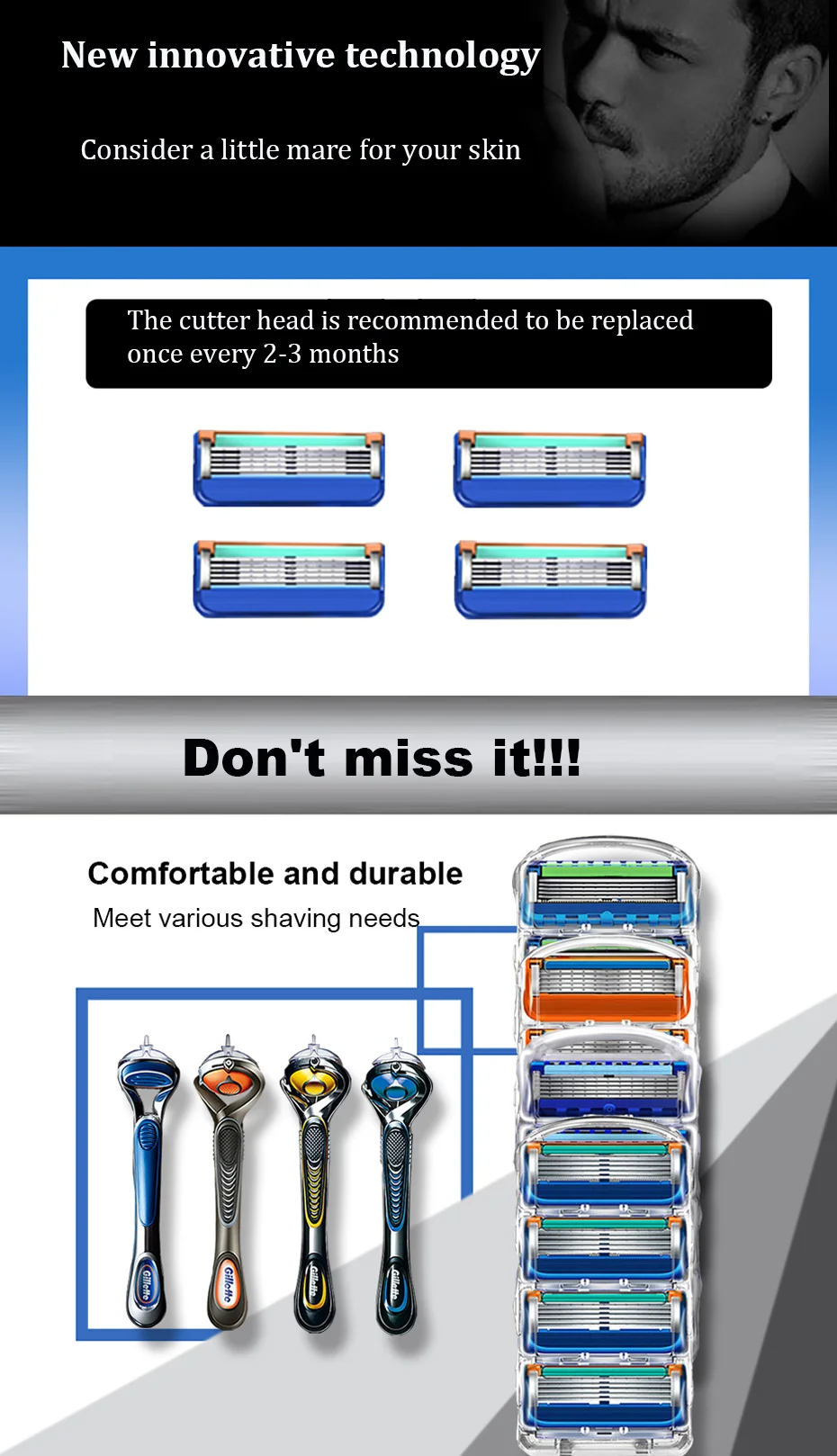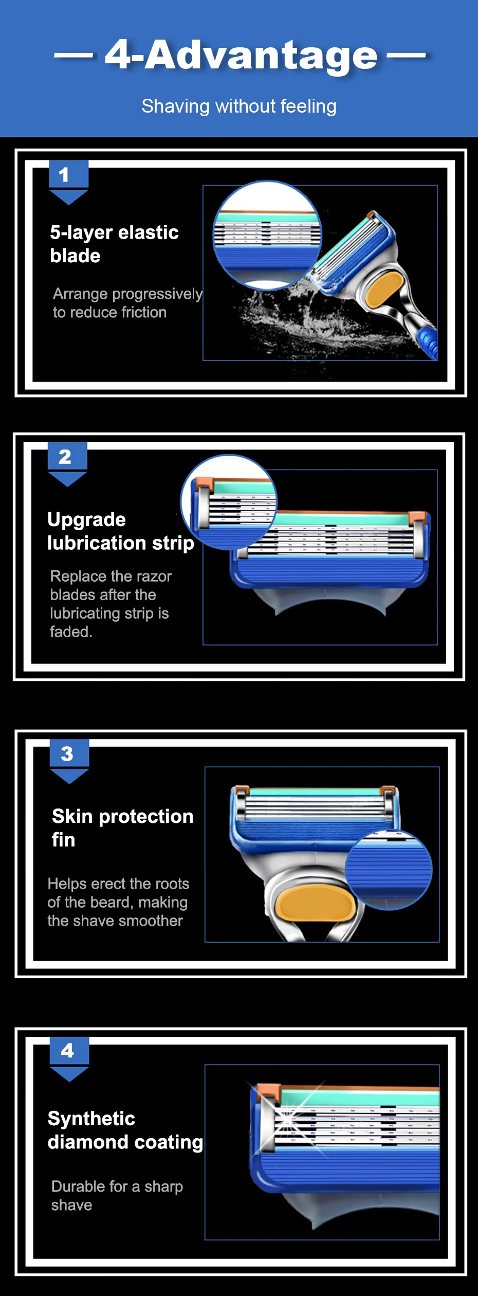 Дружеское напоминание: чтобы обеспечить вам хорошее использование, пожалуйста, замените лезвия бритвы после того, как смазочная полоска потускнела.Сменные лезвия для бритвы из Германии.
