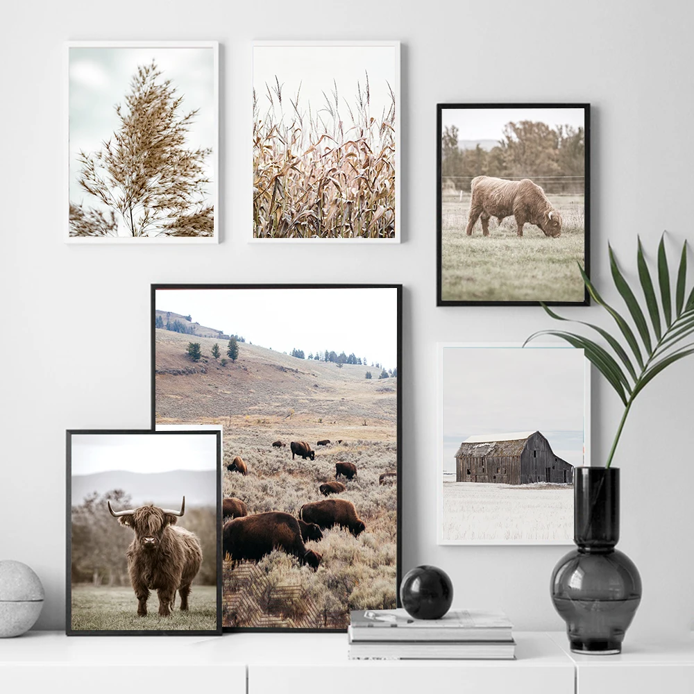 Декор фермерский постер фотография Настенная картина Highland корова животное холст ферма Пшеница растения Печать картины украшение для дома