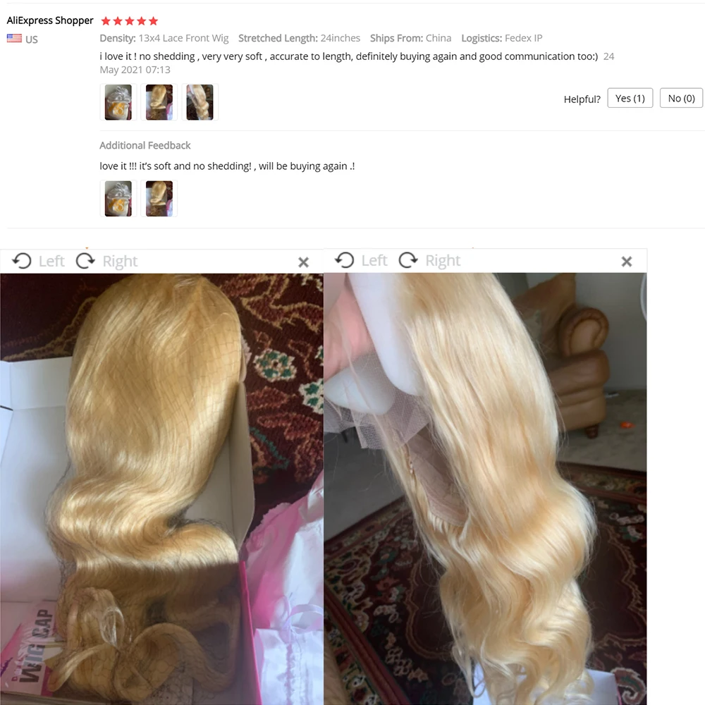 I absolutely love this blonde body wave wig!! It´s true to length and it’s soft, And I have got many compliments from my friends, great communication. Shipping was fastand no tangles no smells and also no shedding which is amazing for 613 hair I will be ordering again