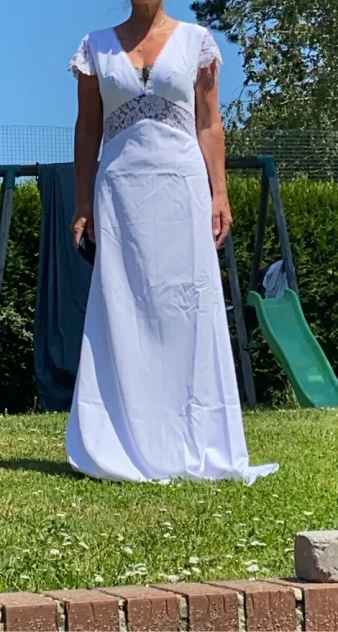 Платье подошло, и оно выглядит точно так же, как на картинке. Качество такое хорошее, и вы никогда не будете знать, что это не из свадебного бутика. Я беспокоюсь только о том, что одна пуговица на задней части платья обесцвечивается, и я не могу носить ее, как в день моей свадьбы. Я приложил фотографию. Я связался с продавцом, который предлагает частичный возврат, который я жду, чтобы получить. Однако это будет легко исправить и учитывая цену платья, которое я не ожидала совершенства.
