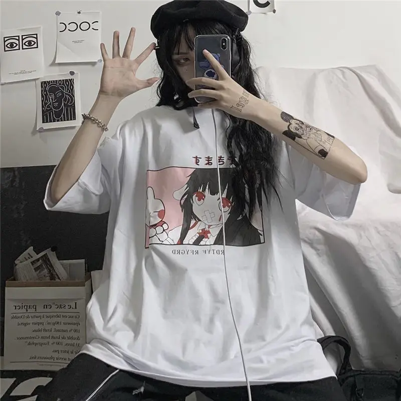Футболка женская с графическим принтом, свободная рубашка с круглым вырезом и короткими рукавами в стиле Харадзюку, размера плюс с готическим Аниме Стиль y2k, лето 2021