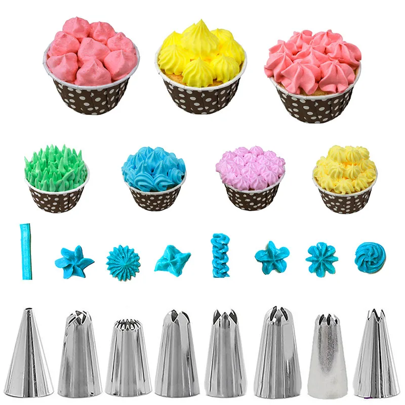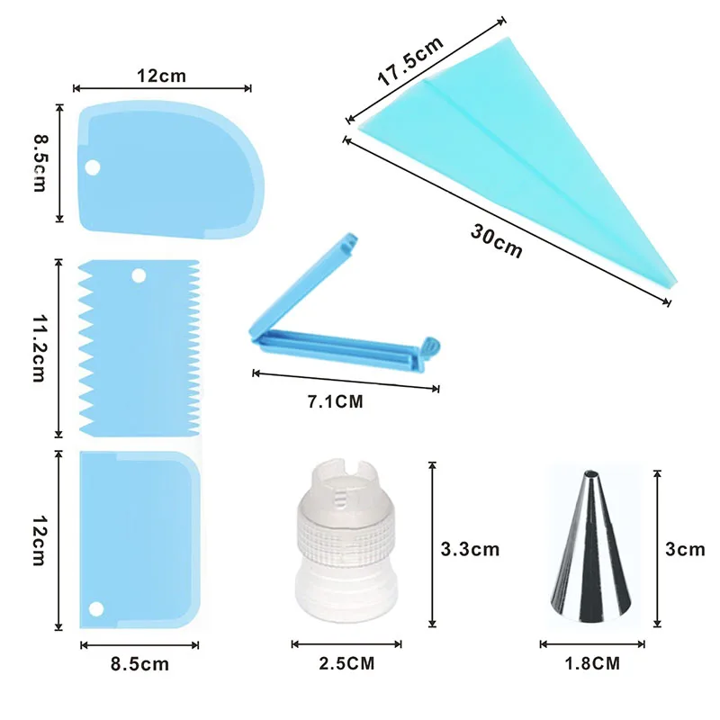 Посылка: 8 насадок для трубопроводов + 1 конвертер + 1 мешок для трубопроводов + 1 зажим для сумки + 3 шпатели для торта