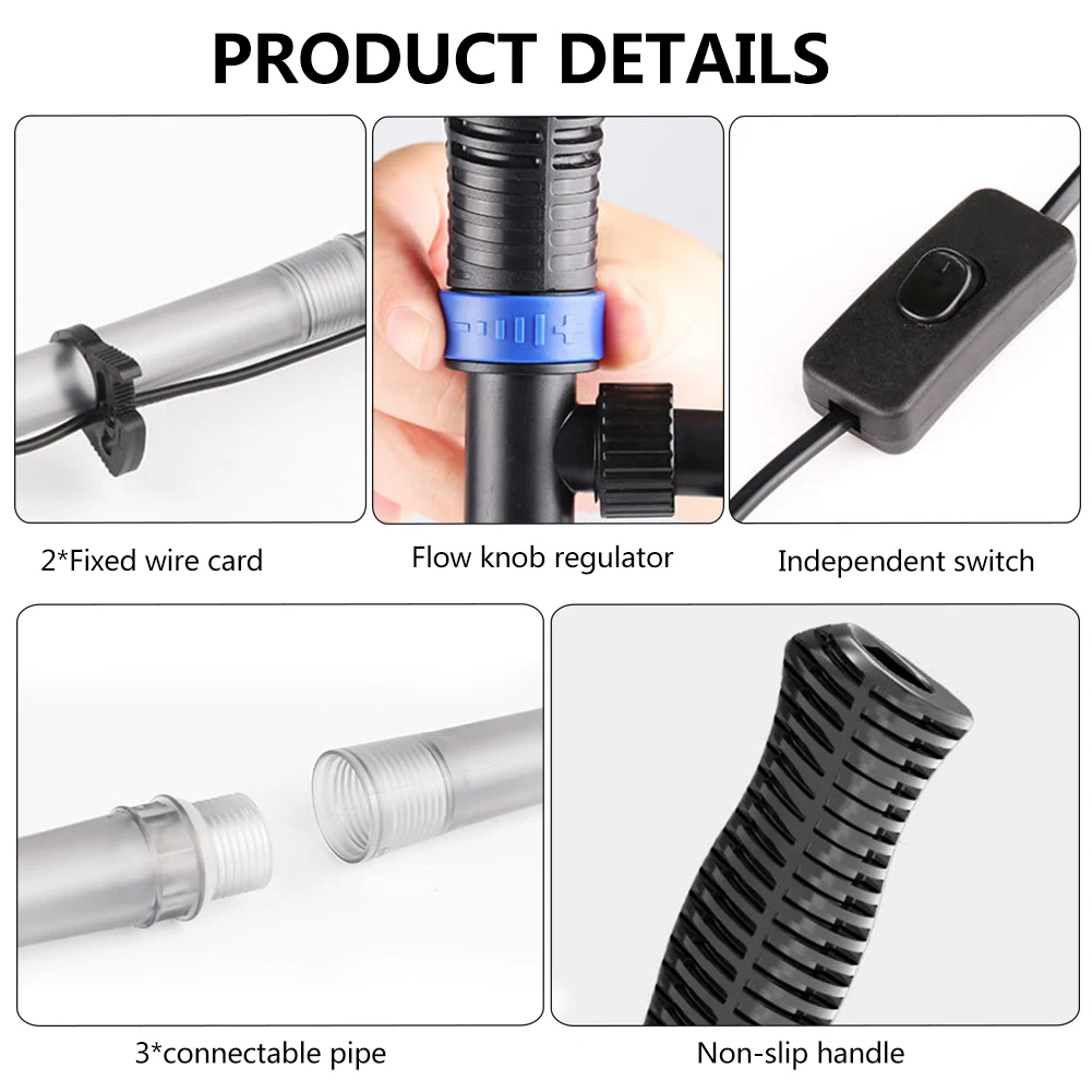 Точки пули:1. Многофункциональный очиститель: очиститель аквариума поставляется с автоматическим всасыванием фекалий, изменением воды, фильтрацией и функцией очистки зернистости. Это хороший помощник для вашего аквариума.2. Простота в использовании: длина автоматического пылесоса может быть свободно отрегулирована в соответствии с высотой аквариума; Оснащен независимым переключателем и одним нажатием кнопки.3. Регулируемый расход и мощность всасывания: регулировка расхода и всасывания воды через ручку, чтобы легко и быстро очистить аквариум.4. Циркуляционная система фильтрации: встроенная двухслойная система фильтрации, которая может эффективно очищать качество воды, экономя время и усилия.5. Несколько комбинаций: с 3 различными сменными соединениями и 2 м водопроводными трубами, гравием, сифоном рыбным навозом и другой грязью можно эффективно удалять без изменения воды.Особенности:1. Многофункциональный очиститель: очиститель аквариума поставляется с автоматическим всасыванием фекалий, изменением воды, фильтрацией и функцией очистки зернистости. Это хороший помощник для вашего аквариума.2. Простота в использовании: длина автоматического пылесоса может быть свободно отрегулирована в соответствии с высотой аквариума; Оснащен независимым переключателем и одним нажатием кнопки.3. Регулируемый расход и мощность всасывания: регулировка расхода и мощности всасывания воды через ручку, чтобы легко и быстро очистить аквариум.4. Циркулирующая система фильтрации: встроенная двухслойная система фильтрации, которая может эффективно очищать качество воды, экономя время и усилия.5. Несколько комбинаций: с 3 различными сменными соединениями и 2 м водопроводными трубами, гравием, сифоном рыбным навозом и другой грязью можно эффективно удалять без изменения воды.Спецификация:Мощность: 16 ВтМаксимальный ход: 1,6 мМаксимальный поток: 800 л/чНачальный уровень воды: погружной водяной насосМощность Длина шнура: около 2,5 м/98,43 дюймаРаспределительная водопроводная труба: 12 мм * 2 мРазмер: самый большой размер-около 105 см/41,34 дюйма, самый маленький размер-около 53 см/20,87 дюймаЛинейная карта: поставляется с 2 линейными картами, вы можете прикрепить шнур питания к водоотводной трубеРегулятор расхода: Регулировка выхода воды и всасыванияНезависимый переключатель: настройка запуска одной кнопкой, простота в использованииТелескопический рукав: свободно регулируется в соответствии с высотой аквариумаПротивоскользящая ручка для воды: против царапинФункция: Электрический Очиститель аквариума для поглощения табурета, замены воды, фильтра для предотвращения помехУпаковочный лист:Очиститель для аквариума * 12 м шланг * 1