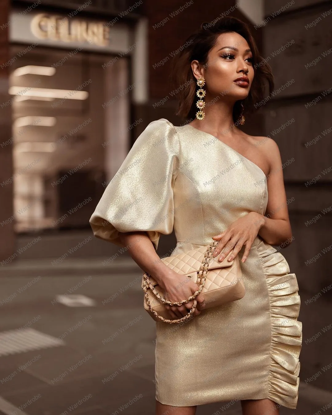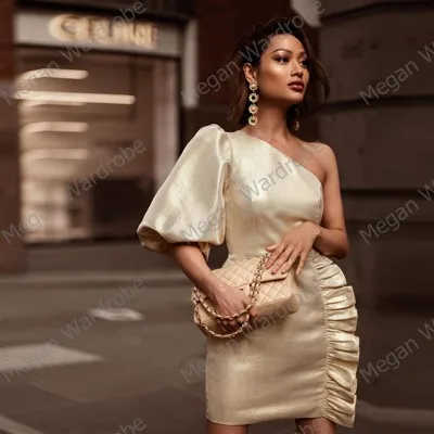 Элегантные короткие платья из ткани, женский халат с пышными рукавами на одно плечо, Платья-мини с оборками, коктейльное платье-Русалка для вечерние