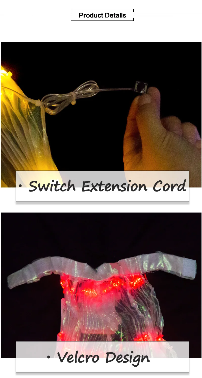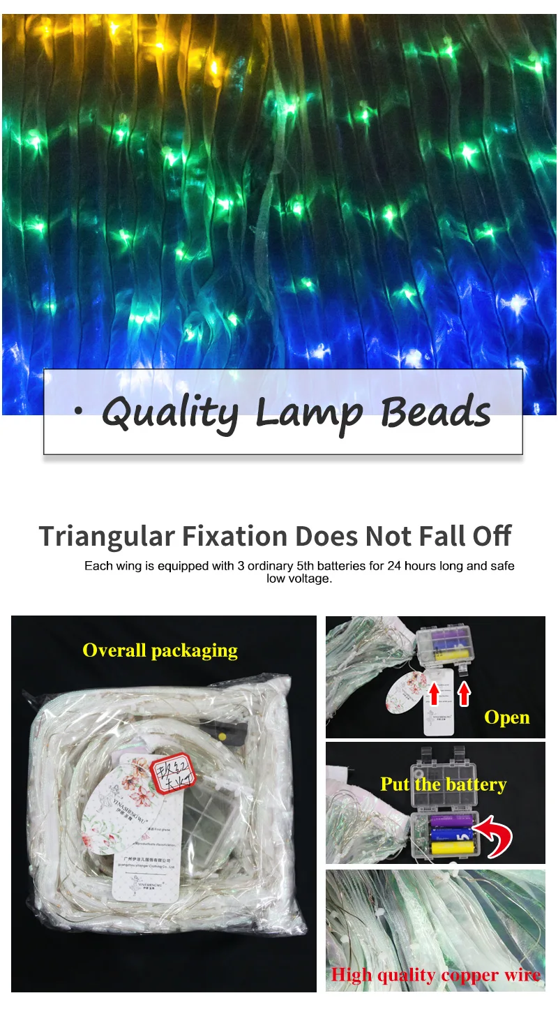 Красивые крылья,лампочки работают в двух режимах и на рост взрослого. Быстро пришёл за 2 недели .Довольна !