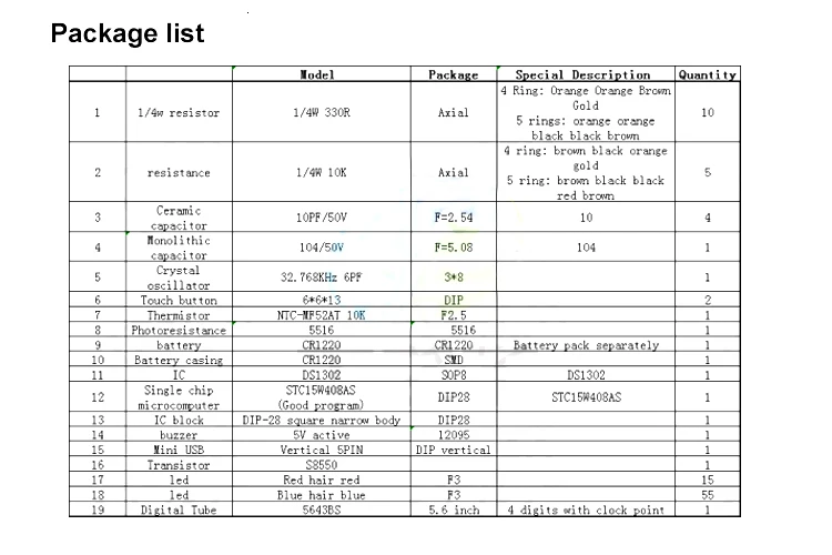 Общая проблема:1. Заказ на сварку неисправен, сначала рекомендуется припаять светодиодный светильник, затем задние компоненты, затем цифровую трубку и, наконец, вставить чип.2. Обратите внимание на положительные и отрицательные полюсы светодиодный лампы и положительный полюс длинной стопы.3. Зазубрина чипа и базовая зазубрина должны соответствовать зазубрине, отмеченной на доске.4. Зуммер должен обратить внимание на положительные и отрицательные полюсы, длинный положительный полюс, и значение сопротивления должно следовать за доскойОбозначено на.5. Подключите Триод в ту же форму, что и плата.6. Обратите внимание на направление цифровой трубки, Десятичная точка ниже.7. Обратите внимание на положительные и отрицательные полюсы, а напряжение постоянного тока-5 В.8. Проверьте явление сварки короткого замыкания и виртуальной сварки. Это явление очень распространено.9. Если дисплей является ненормальным или время не уходит, удалите DS1302 и кнопкиБатарея, а затем подключите DS1302, без аккумулятора, затем включите,Положите батарею обратно после нормального режима.10. Если отдельные лампы не включены, Проверьте короткое замыкание выключенных ламп иСварка, проверьте его и измените лампу, если он не включен.11. Если четыре цифровых трубки имеют один и тот же код сегмента всегда включен и выделен,Некоторые светодиодный s всегда включены, потому что один светодиодный поврежден статической сваркой, Привели к цифровой трубке, разделяющей один чип микрокомпьютер pin с этой лампойНа коды сегментов и другие светодиоды влияют, оборачивается работа, чтобы переключиться наСветодиодный светильник с часами, смотрите, какой светодиодный индикатор 60 s должен быть включенЕсли светодиодный индикатор выключен, что-то не так с этим светодиодный, просто замените его.