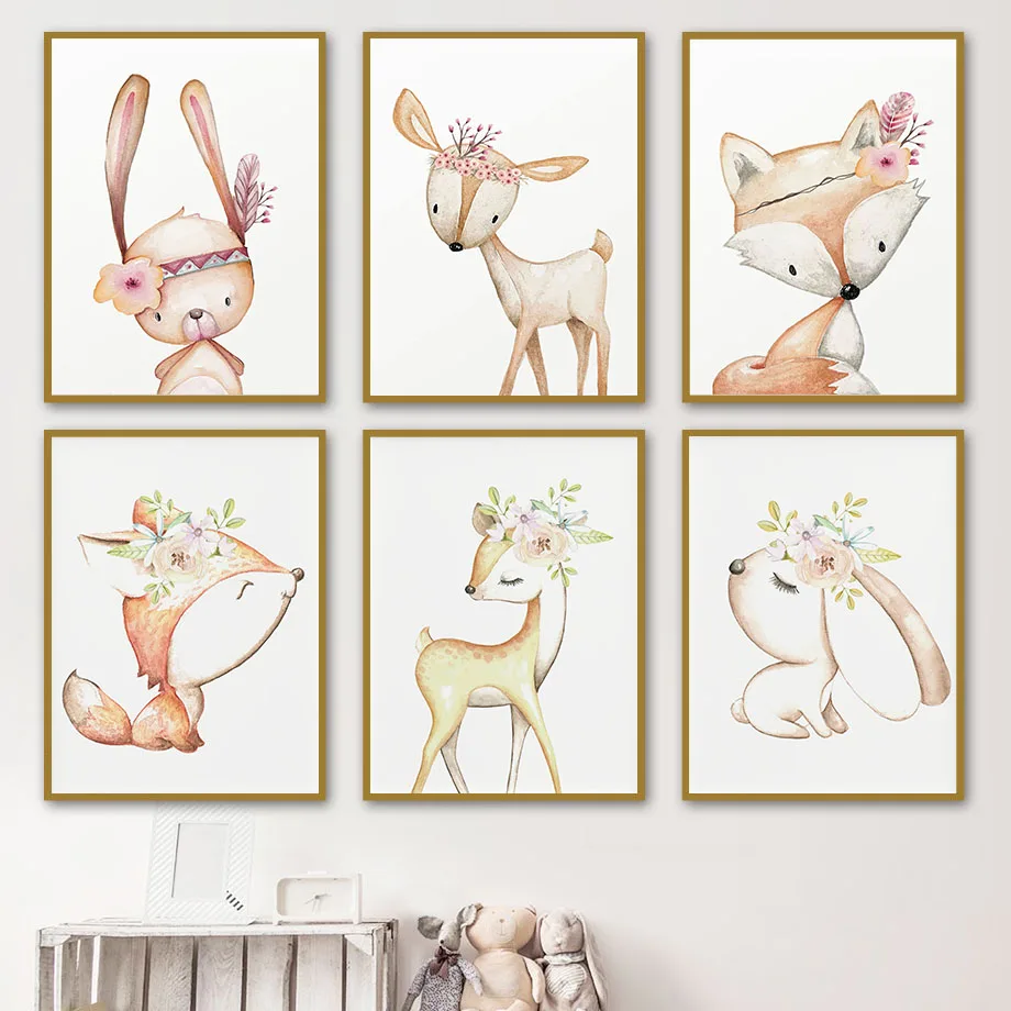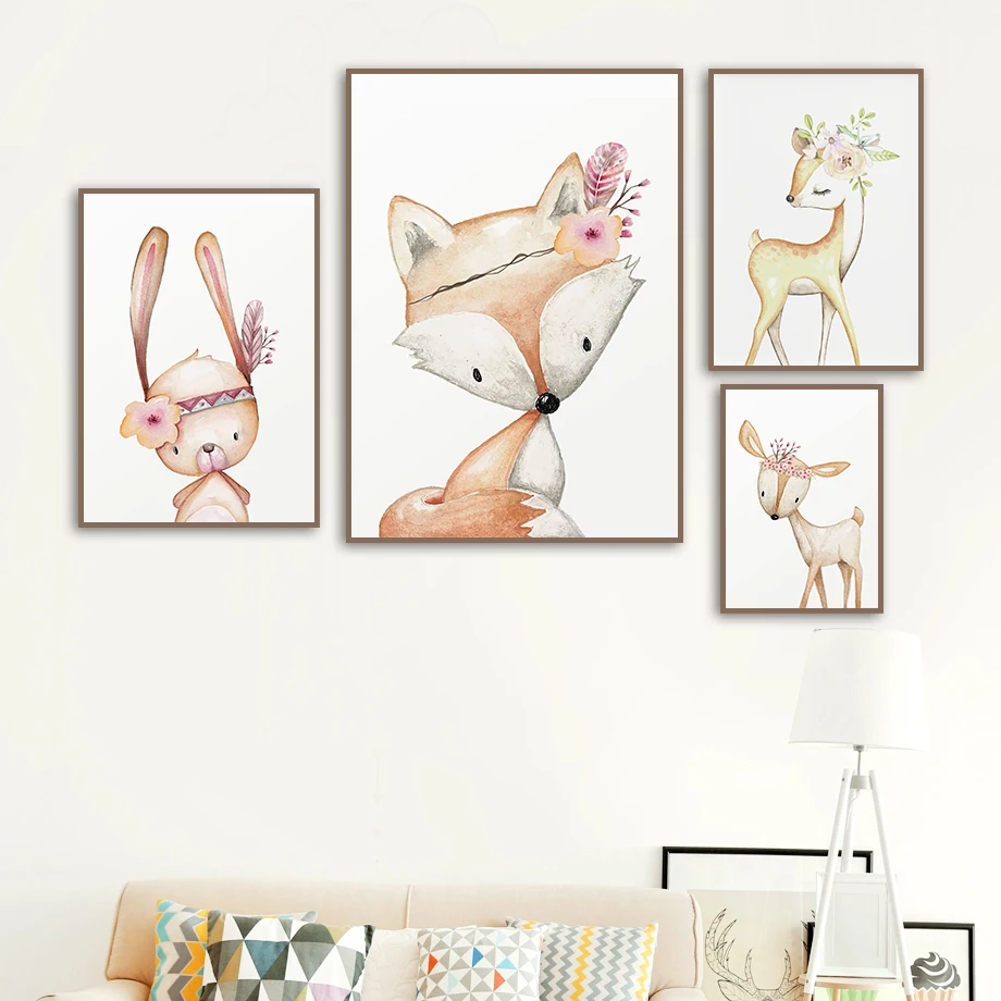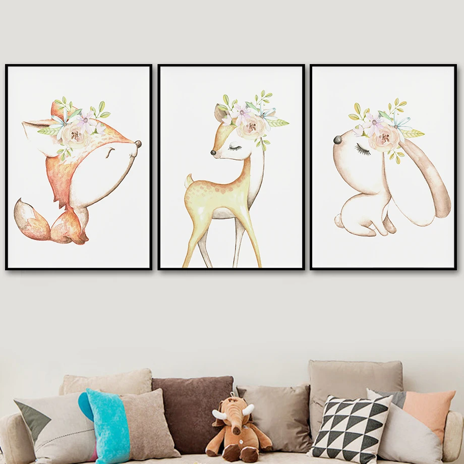Милый Лисий кролик Сика олень цветы Настенная Картина на холсте скандинавские постеры и принты Мультяшные настенные картины для декора детской комнаты
