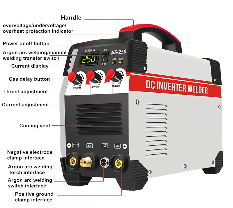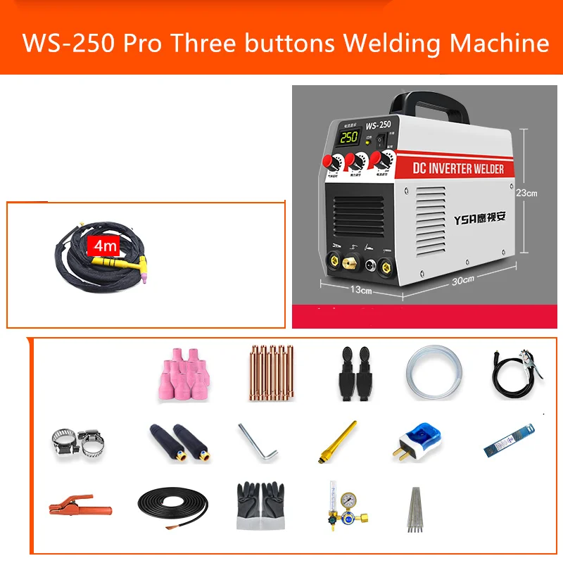 WS-250 Двойные кнопки сварочный аппаратВходное напряжение: 220 ВМощность: 7 кВтРежим экономии газа: плавная регулировка 0-6SЭлектросварка: 2-10 ммTIG сварка: 0,2-5 ммРазмеры: 30*13*23 смПрименимые материалы: нержавеющая сталь, железо, углеродистая стальWS-250 Pro три кнопки сварочный аппарат (регулировка тяги)Спецификация:Входное напряжение: 220 ВМощность: 7,5 кВтРежим экономии газа: плавная регулировка 0-6SЭлектросварка: 2-10 ммTIG сварка: 0,2-5 ммРазмеры: 37*15*30 смПрименимые материалы: нержавеющая сталь, железо, углеродистая стальWS-250 двойных кнопок комплектация:1 х мини-сварочный аппарат1x4 м аргонодуговая Сварочная горелка1 х сварочный колпачок10 фарфоровых насадок10 х зажимов для вольфрамовых игл2 переключателя сварофонарь1 х 3 м трахея1 х хомут для шланга1 заземляющий провод 2 м2 x Разъем1 х гаечный ключ1 x Вилка питания1x1,6 Вольфрамовая игла1 х сварочные щипцы1 пара перчаток1 х водородный счетчикWS-250 Pro три кнопки комплектация:1 Профессиональный сварочный аппарат1x4 м аргонодуговая Сварочная горелка1 х сварочный колпачок10 фарфоровых насадок10 х зажимов для вольфрамовых игл2 переключателя сварофонарь1 х 3 м трахея1 х хомут для шланга1 заземляющий провод 2 м2 x Разъем1 х гаечный ключ1 x Вилка питания1x1,6 Вольфрамовая игла1 х сварочные щипцы1 пара перчаток1 х водородный счетчик