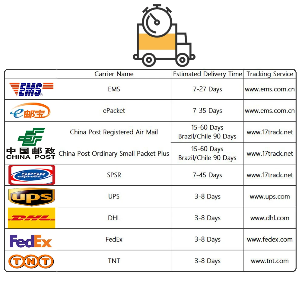 ♡Обычно мы отправляем ваш заказ в течение 48 часов после получения оплаты. (В праздничные и воскресенье мы не можем отправить заказ вовремя, надеемся на понимание.)♡Иногда из-за медленного обновления информации о логистике информация об отслеживании посылки обновляется в течение 3-5 дней.♡Время доставки зависит от страны назначения и других неопределенных факторов, обычно это занимает около 10-30 дней обычной почтой (AliExpress Стандартная доставка, ePacket, авиа-отправление Почты Китая и т. д.).♡Пожалуйста, убедитесь, что ваш адрес и полное имя указаны верно на английском языке