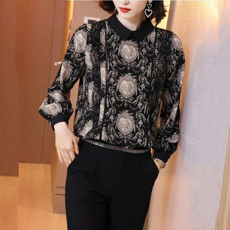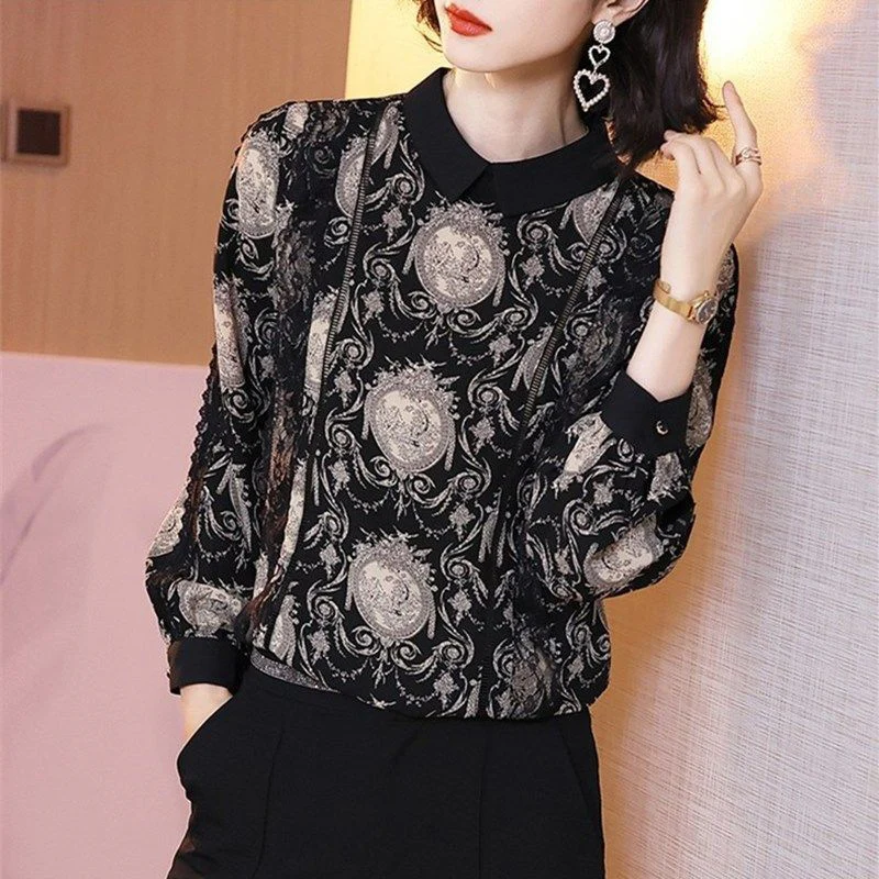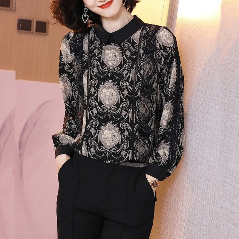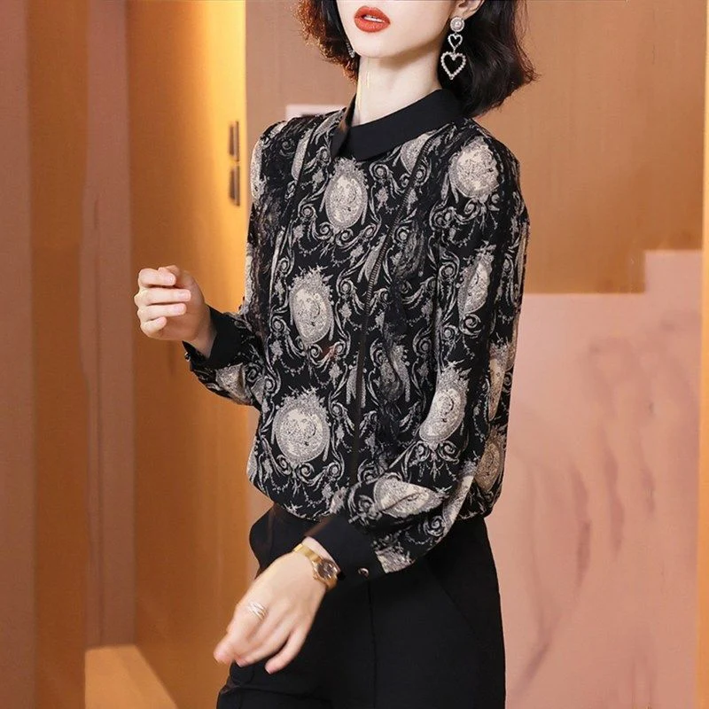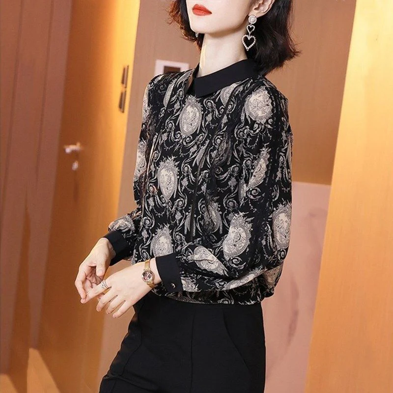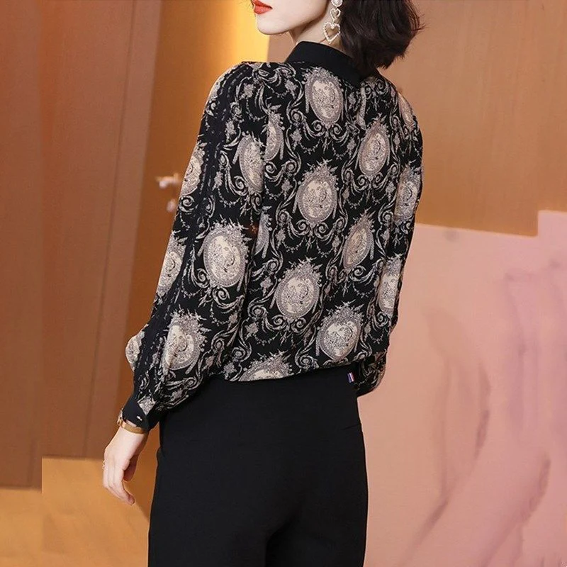 Женские весенне-осенние стильные элегантные женские блузки рубашки повседневные блузы с длинным рукавом и воротником-стойкой с принтом DF3952