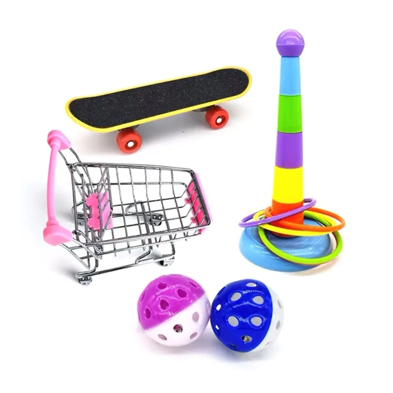 Креативные и интерактивные игрушки: Тренировочный Набор для птиц предназначен для улучшения интеллекта птиц и создания большего удовольствия для них; Игрушки с кольцом-петлей могут помочь вашим птицам распознать размеры; Скейтборд может тренировать ноги; корзина с колесами может удовлетворить птиц по-разному, эффективно продвигая их умственное и физическое здоровье.