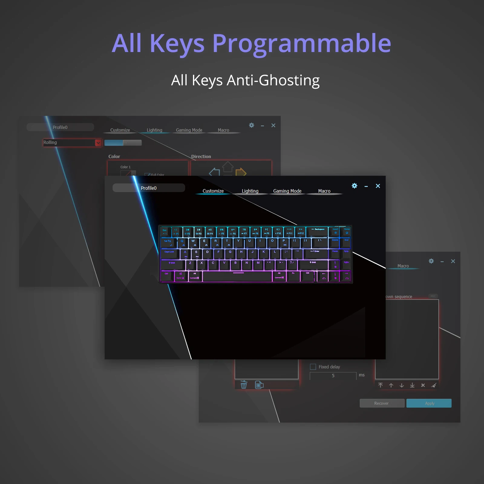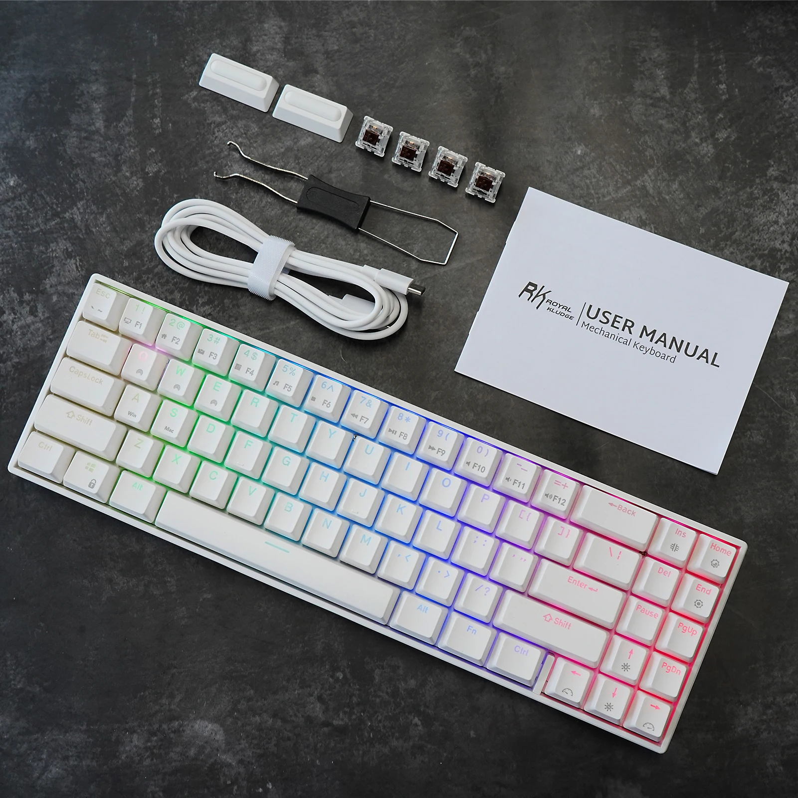 RK Royal Kludge RK71-это механическая клавиатура RGB с 71 клавишами, которая имеет независимые клавиши со стрелками. Он поддерживает Bluetooth и проводные двухрежимные соединения с устройством и совместим с Windows / MacOS / Android и другими системами. Он имеет различные конструкции приложений, такие как все ключи без коллизии, регулируемая RGB подсветка и Sidelight, Сделайте свою собственную функцию ключа и многофункциональную комбинацию клавиш FN.