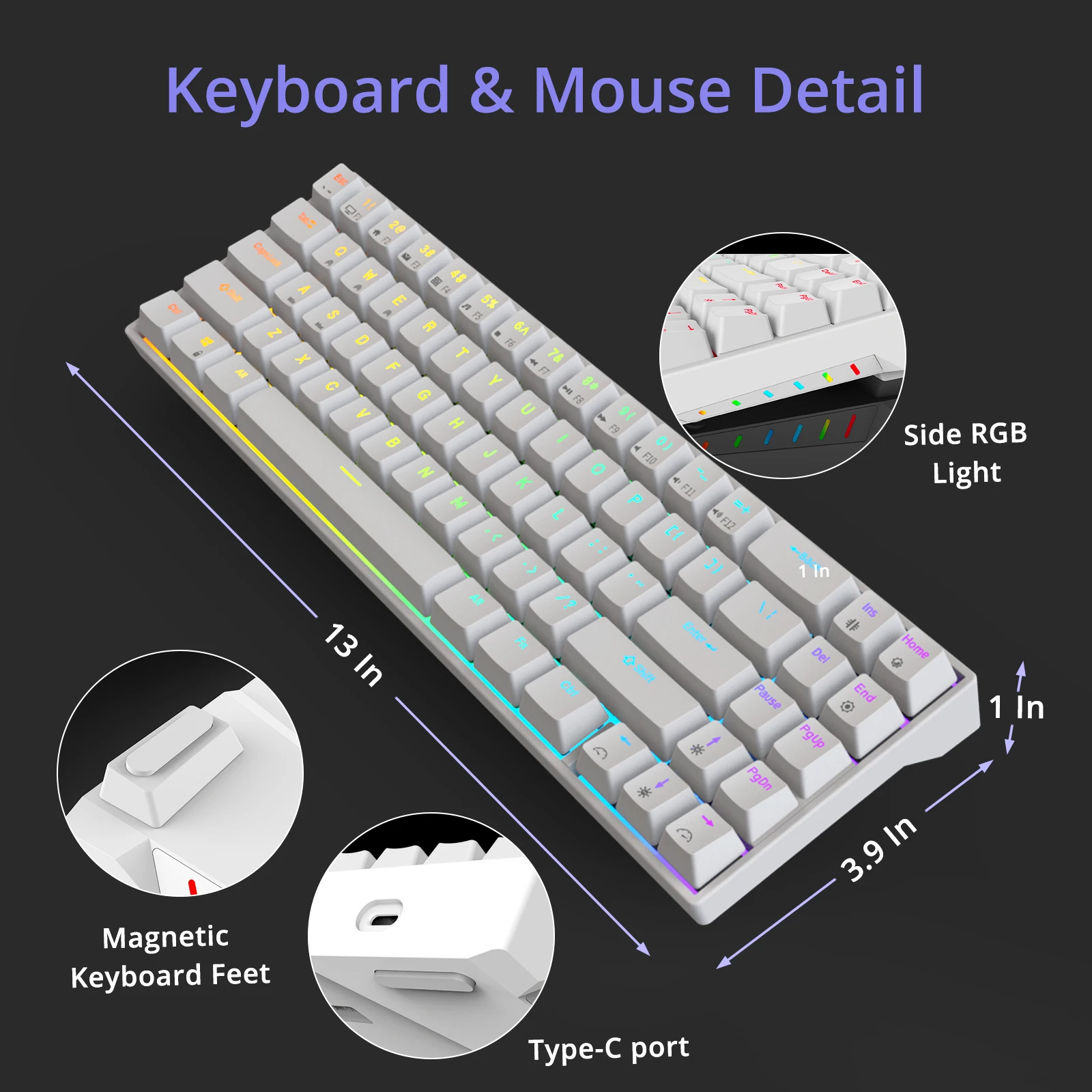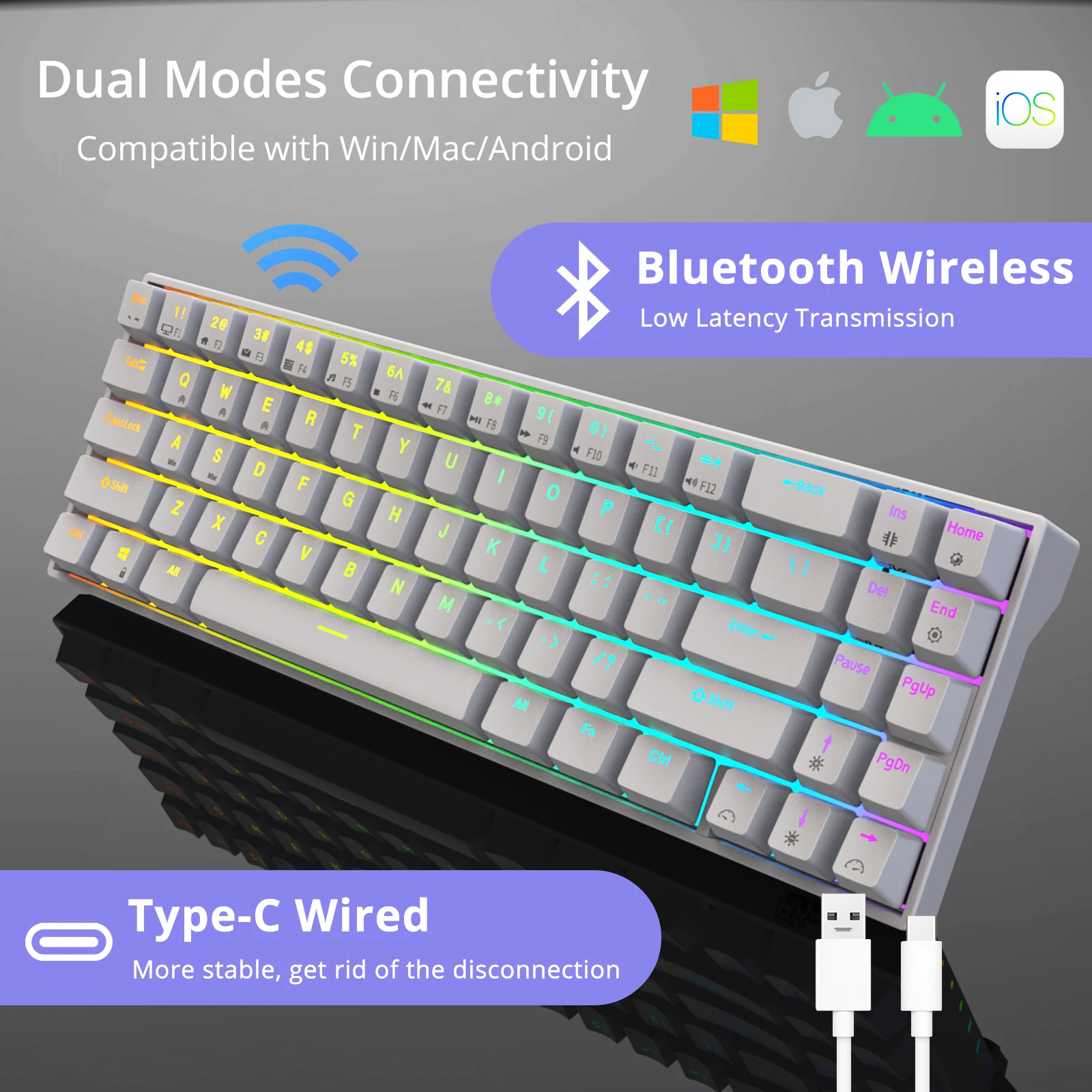 Размеры: 13x4x1.6inchesКомпоновка: 71 клавишаПодключение: USB Type-C проводной, Bluetooth беспроводнойПодсветка/Подсветка: RGBМатериал: АБС-пластикКабель: 67 дюймов USB кабель Type-cПереключатель: синий или коричневый или красныйЦвета клавиатуры: черный или белыйРежимы: Bluetooth 5,0 и USBНапряжение: 5 ВПоддержка систем: Windows XP/VISTA/7/8/10, IOS, Macos, Linux, Android