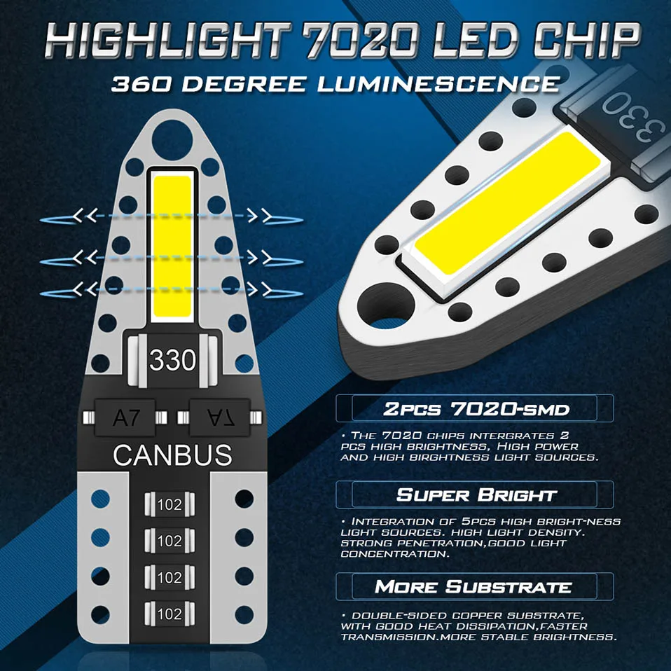 Напряжение: 12 В Ток: 0,03 а Цветовая температура: Белый 6500 К Чипсеты: 2 шт 7020 SMD Люмен: 120 лм Срок службы: 6000 часов Разъемы: W5W 194 147 152 158 159 161 168 175 184 192 193 259 280 Применение: для внутреннего освещения (карта, купол, груз, дверь), багажника светильник купольного светильник щения, светильник пы для чтения и т. д.