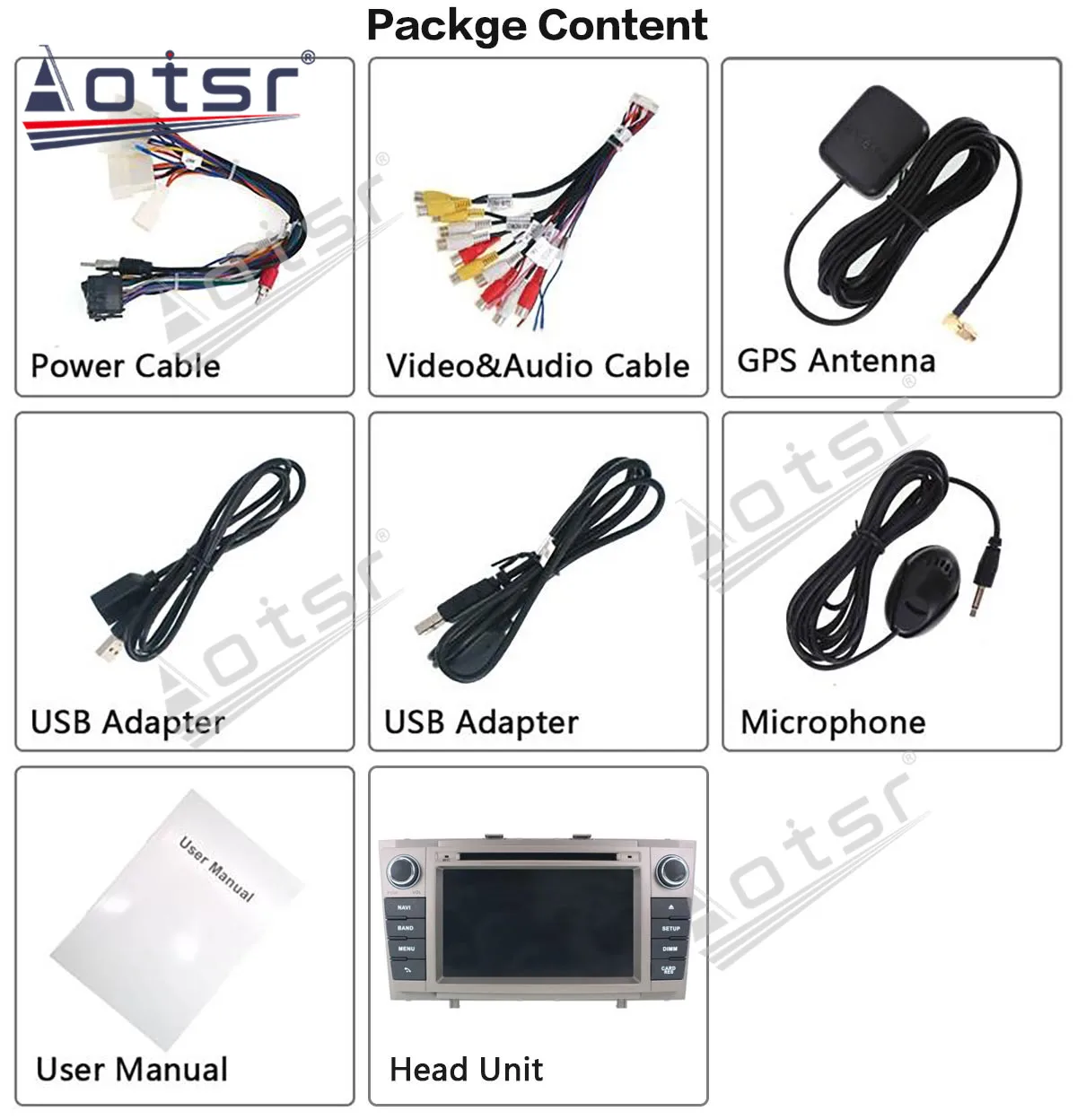 Наш продукт поставляется с GPS антенной, gps-картой для вашей страны, usb-адаптером, аудио и видео входным кабелем, кабелем питания... и т. д., все наборы для установки будут в посылка.