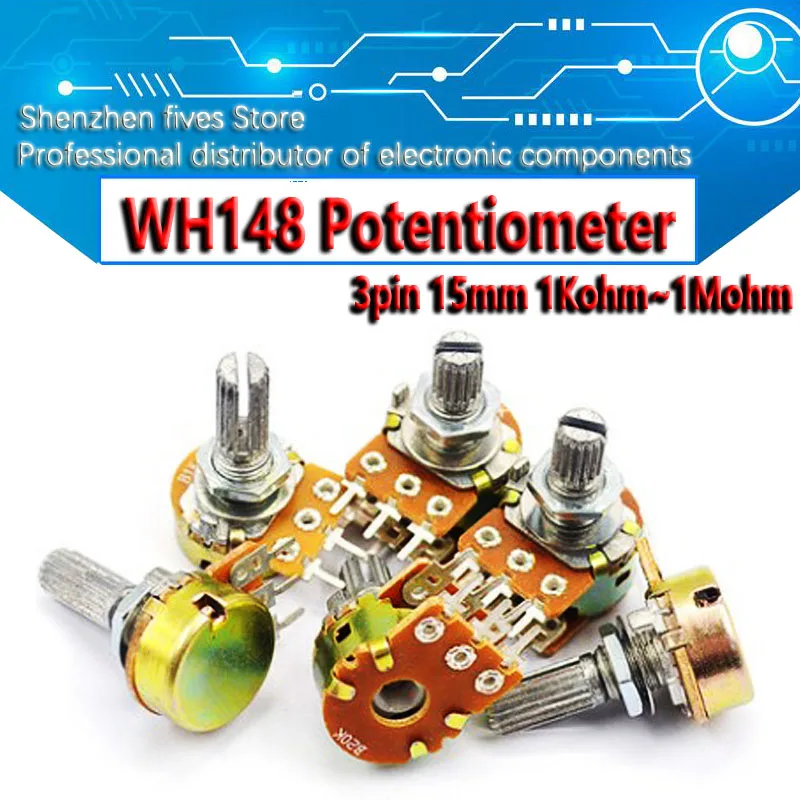 Потенциометр WH148 3Pin 15 мм, B1K B2K B5K B10K B20K B50K B100K B250K B500K B1M 1K 2K 5K 10K 20K 50K 100K 250K 500K 1 м, 5 шт.