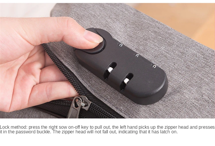 Метод блокировки: нажмите на кнопку ВКЛ-ВЫКЛ правого большого пальца, чтобы вытянуть, левая рука поднимает головку молнии и нажимает ее в застежке с паролем. Головка молнии не выпадет, указывая, что на ней есть защелка.