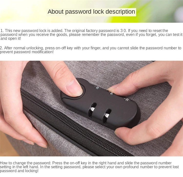* Как изменить пароль: Нажмите кнопку ВКЛ-ВЫКЛ в правой руке и Сместите настройки Номера паролей в левой руке. В настройке пароль, пожалуйста, выберите свой собственный глубокий номер, чтобы предотвратить потерю паролей и блокировку!1. Эта Новая Блокировка паролей добавляется. Оригинальный заводской пароль-000. Если вам нужно сбросить пароль при получении товара, пожалуйста, запомните пароль, даже если вы забудете, вы можете проверить его и открыть!2. После обычной разблокировки нажмите кнопку ВКЛ-ВЫКЛ пальцем, и вы не можете скользить по номеру паролей, чтобы предотвратить модификацию паролей!