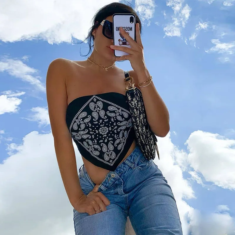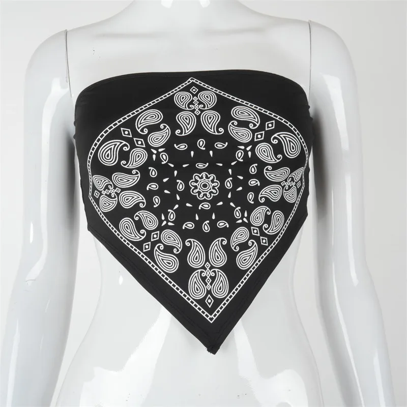 Женский богемный Топ без бретелек, Черный Уличный Топ без рукавов с принтом, модель 2020 года