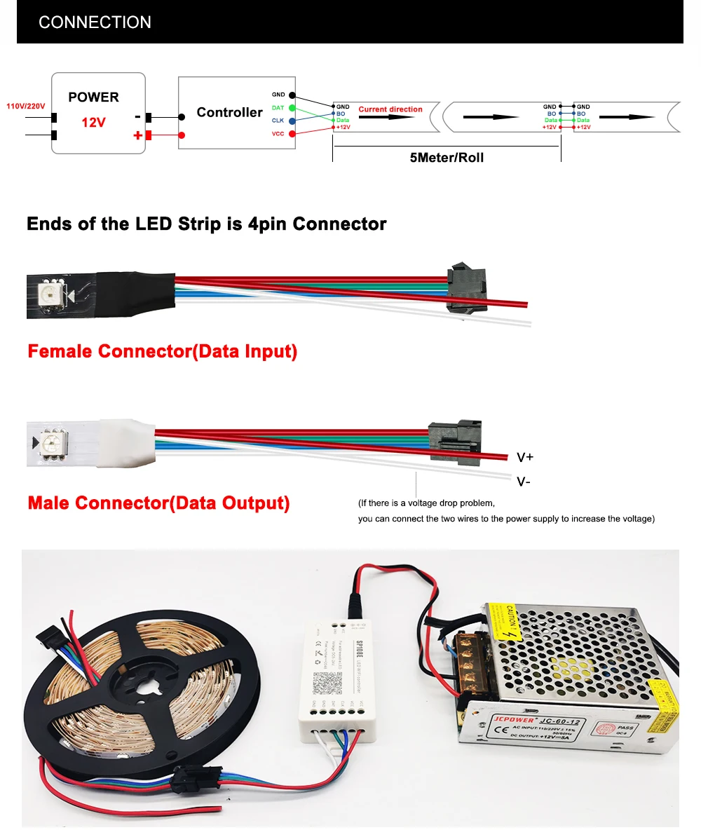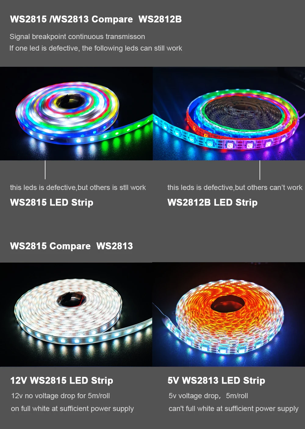 2.WS2815 должен использовать блок питания DC12V и светодиодный контроллер управления для управления!