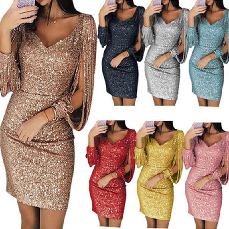 Вечерние нее платье для женщин, большие размеры 3XL, 7 цветов, сексуальное однотонное Клубное платье-футляр с V-образным вырезом и блестками, мини-платье с длинными рукавами