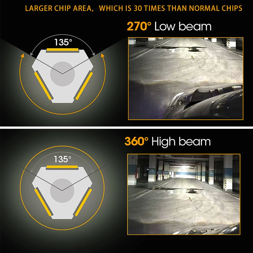 Угол луча: 270 градусов @ ближний свет, 360 градусов @ Дальний свет