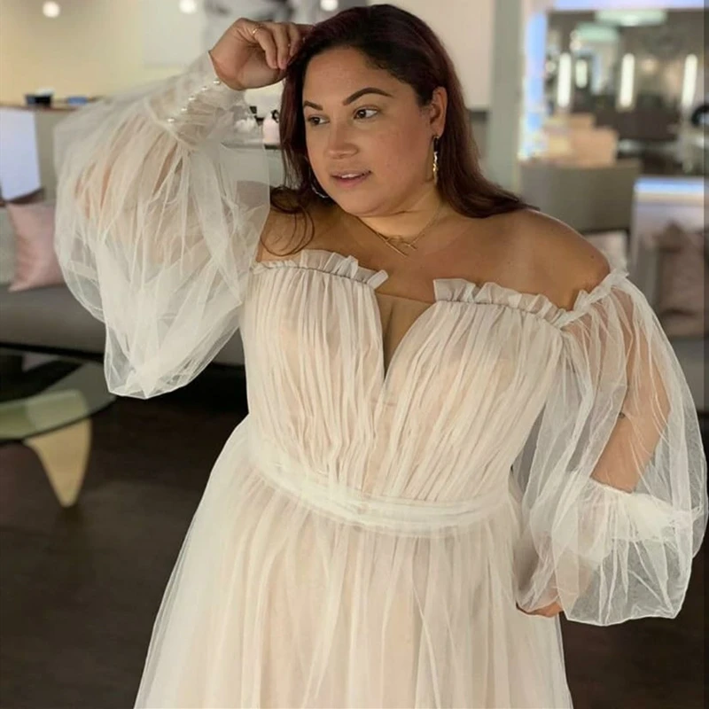 Женское свадебное платье с открытыми плечами, длинным пышным рукавом, женское мягкое Тюлевое платье трапециевидной формы, свадебное платье
