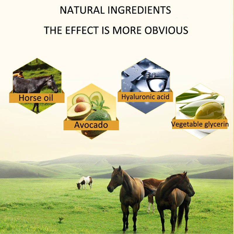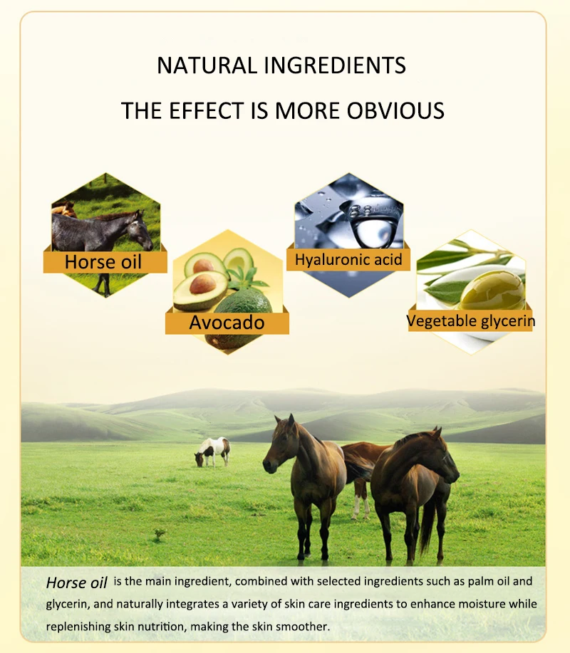 Лошадиное масло является основным ингредиентом, в сочетании с подобранными ингредиентами, такими как пальмовое масло, глицерин и т. Д., и, естественно, интегрирует различные ингредиенты для ухода за кожей для повышения влажности, восполняя питание кожи, делая кожу более гладкой.