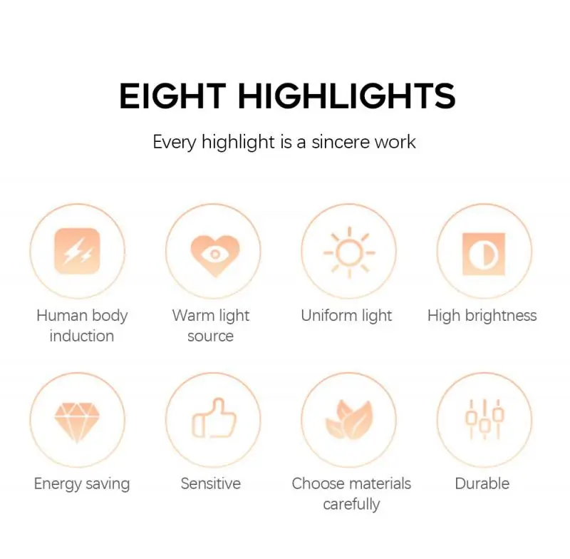 Eatures: Изготовлен из высококачественных материалов, прочный, прочный, практичный и длительный срок службы. Встроенный датчик чувствительности человеческого тела, широкий диапазон чувствительности, он автоматически запустится при обнаружении движения человеческого тела.
