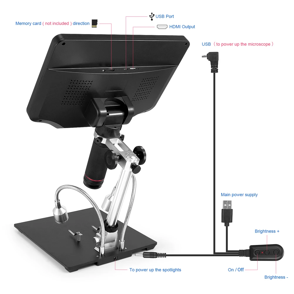 Особенности:✮1,3-дюймовый Регулируемый ЖК-дисплейРегулируемая металлическая подставка и монитор✮Два металлических фиксированных зажима✮Карта Micro-SD✮Захват и запись✮Встроенные регулируемые светодиоды✮Hdmi/USBПоддержка программного обеспечения для измеренийПосылкаМикроскоп × 1Металлическая подставка × 1УФ-фильтр (уже собранный в объективе) × 1Инструкции × 1ИК-пульт × 1Кабель переключателя × 1Адаптер питания × 1Кабель HDMI × 1