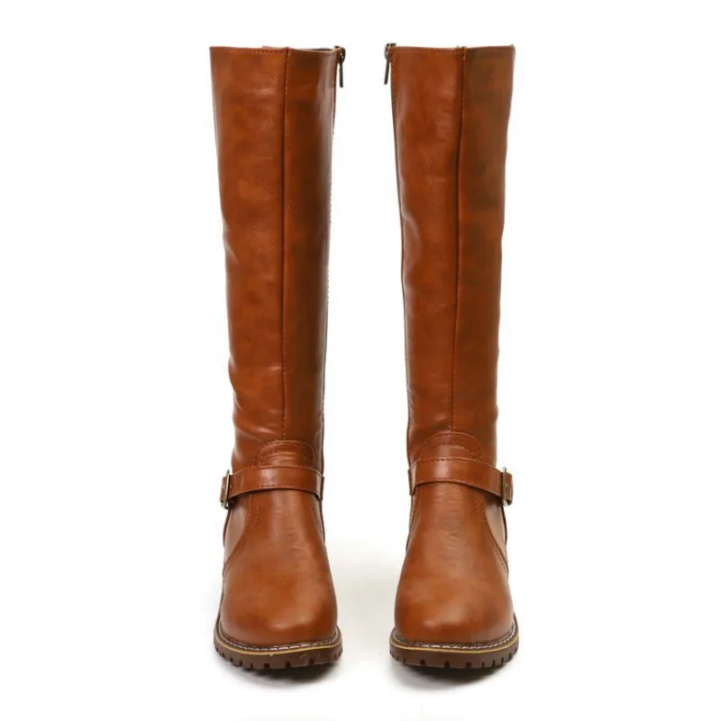 ботинки зимние женскик Женские высокие сапоги из искусственной кожи, повседневные сапоги для верховой езды на низком каблуке, на платформе и молнии, с пряжкой, черные, коричневые, в стиле ретро, Осень-зима 2021