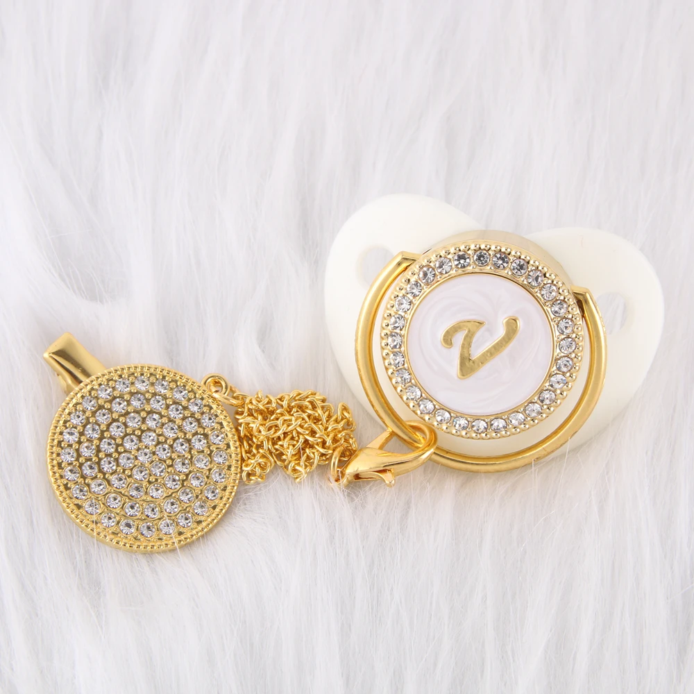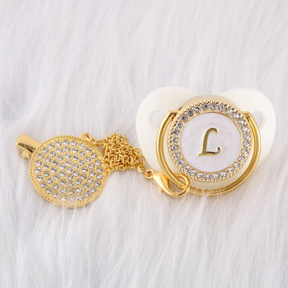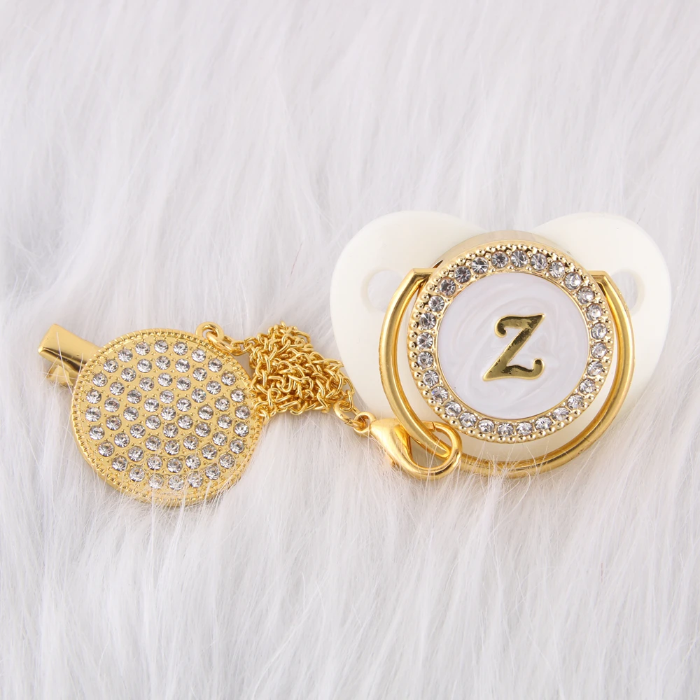От 0 до 12 месяцев 26 название инициалы письмо Роскошные детские соски с зажимами Bling соска для младенцев BPA бесплатно новорожденных кормления Sucette Chupeta