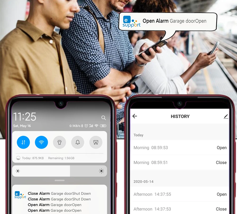 Независимо от того, где вы находитесь, вы получите сообщение приложения, когда ваша дверь гаража открывается/закрыта, и вы можете проверить историю гаражных ворот.