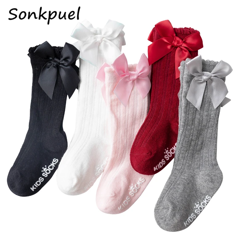 Для малышей на лето и весну, носки для детей, начинающих ходить, плaтьe yкрaшeннoe блёсткaми с сапоги до колена длинные мягкие хлопковые кружевные детские носки с бантом, носки, одежда для малышей