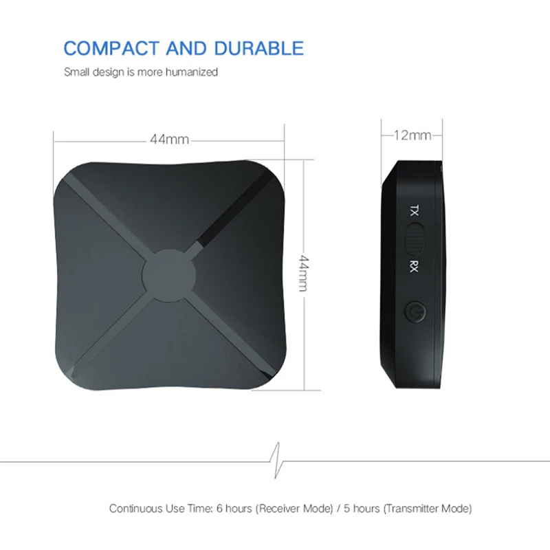 4. Переключение между режимами передатчика и приемника с простым щелчком переключателя. Легко подключить, используя передовые технологии Bluetooth и 3,5 мм аудио кабель (все указанные аккумуляторы входят в комплект поставки).