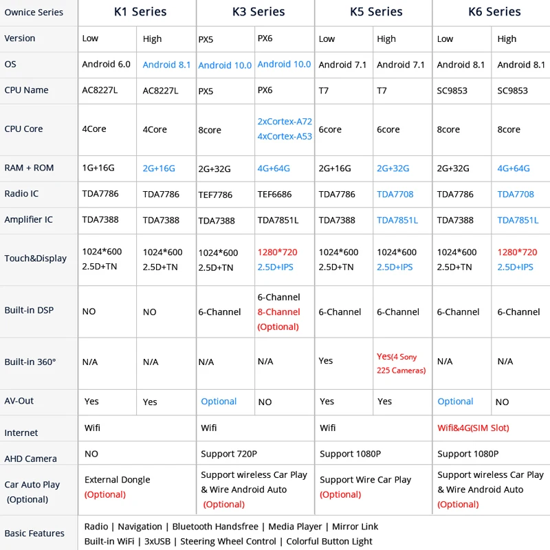 K3-PX5 ------- PX5 | Android 10,0 | 2 ГБ + 32 Гб | 2.5D + TN | Радио TEF7786 | Усилитель TDA7388K3-PX6 ------- PX6 | Android 10,0 | 4 Гб + 64 Гб | 2.5D + IPS |1280*720 | Радио TEF6686 | Усилитель TDA7851LK6-Low ------- SC9853 | Android 8,1 | 2G + 32GB | 2.5D + TN | Радио TDA7786 | Усилитель TDA7388K6-High ------- SC9853 | Android 8,1 | 4 Гб + 64 Гб | 2.5D + IPS |1280*720 | Радио TDA7708 | Усилитель TDA7851LK5-Low ------- T7 | Android 7,1 | 2 ГБ + 16 Гб | 2.5D + TN | 1024*600 | Радио TDA7786 | Усилитель TDA7388K5-High ------- T7 | Android 7,1 | 2 ГБ + 32 Гб | 2.5D + IPS | 1024*600 | Радио TEF7708 | Усилитель TDA7851LK1-Low ------- AC8227L | Android 6,0 | 1G + 16GB | 2.5D + TN | 1024*600 | Радио TDA7786 | Усилитель TDA7388K1-High ------- AC8227L | Android 8,1 | 2 ГБ + 16 Гб | 2.5D + TN | 1024*600 | Радио TDA7786 | Усилитель TDA7388